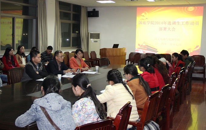 本网讯( 国旅学院 梁超 刘冠琪)3月17日,国土资源与旅游学院在院三楼会议室召开毕业班党员民主生活会暨2014年选调生工作动员部署大会。院党委副书记罗振、2013年选调生代表胡格格以及毕业班研究生、本科生党员出席会议,会议由2010级辅导员梁超老师主持。