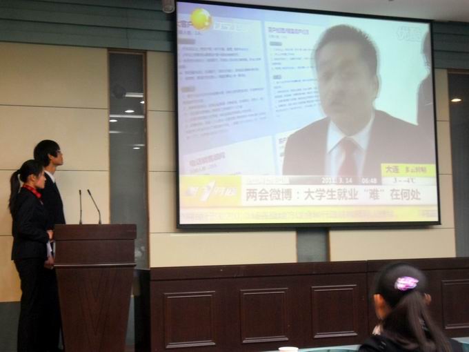 本次比赛共有三支代表队参加,分为三个环节。第一环节,组委会准备了三段视频,分别是关于大学生就业、房价过高和收入分配等“两会”热点问题,三支代表队各选择一段视频,根据视频内容发表自己的时政观点。第二环节为选择题,包含了一些关于“两会”的基本知识,从而扩大同学们的知识面。第三环节为选答题,主要涉及今年“两会”的思想精神、热点内容等,加大了比赛了挑战性,也深化了大家对本次两会的解读。比赛过程中,三支代表队的十二名代表选手各抒己见,各显其才,观众们也认真学习,积极互动。经过激烈的角逐,由09地科的程龙娟、耿苗苗和10地科的张定定、王雪玉组成的第一代表队以微弱优势获得冠军。