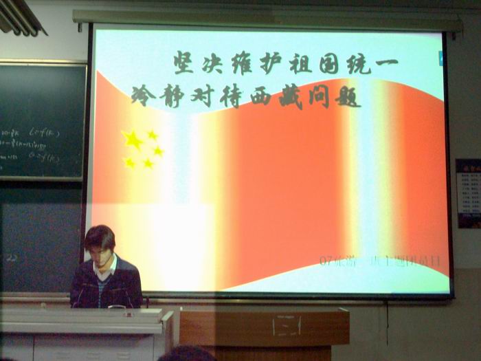 团支部书记通过图片、视频和文字资料向大家介绍了当前的西藏形势和奥运圣火传递过程中受到干扰的情况,然后同学们进行了自由讨论。讨论中同学们主要表达了自己对当前国内外局势的认识,并就奥运火炬在国外传递受阻及合肥家乐福事件进行分析评价。