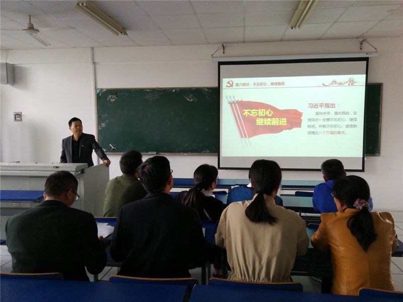 接下来曹院长着重讲解了学习的主题“不忘初心,继续前进”。首先是学习的总体要求,其次是对三个”伟大历史贡献”的理解,然后是对三个“永不动摇的”解读,和对“四个自信”的解释,接下来是详细解读“不忘初心,继续前行”的八个要求。最后,曹院长结合教师本职工作,解读老师的初心是“以生为本,为国育才”,要求全体党员老师立德树人,争做有理想信念,有道德情操,有扎实知识,有仁爱之心的四有好老师。