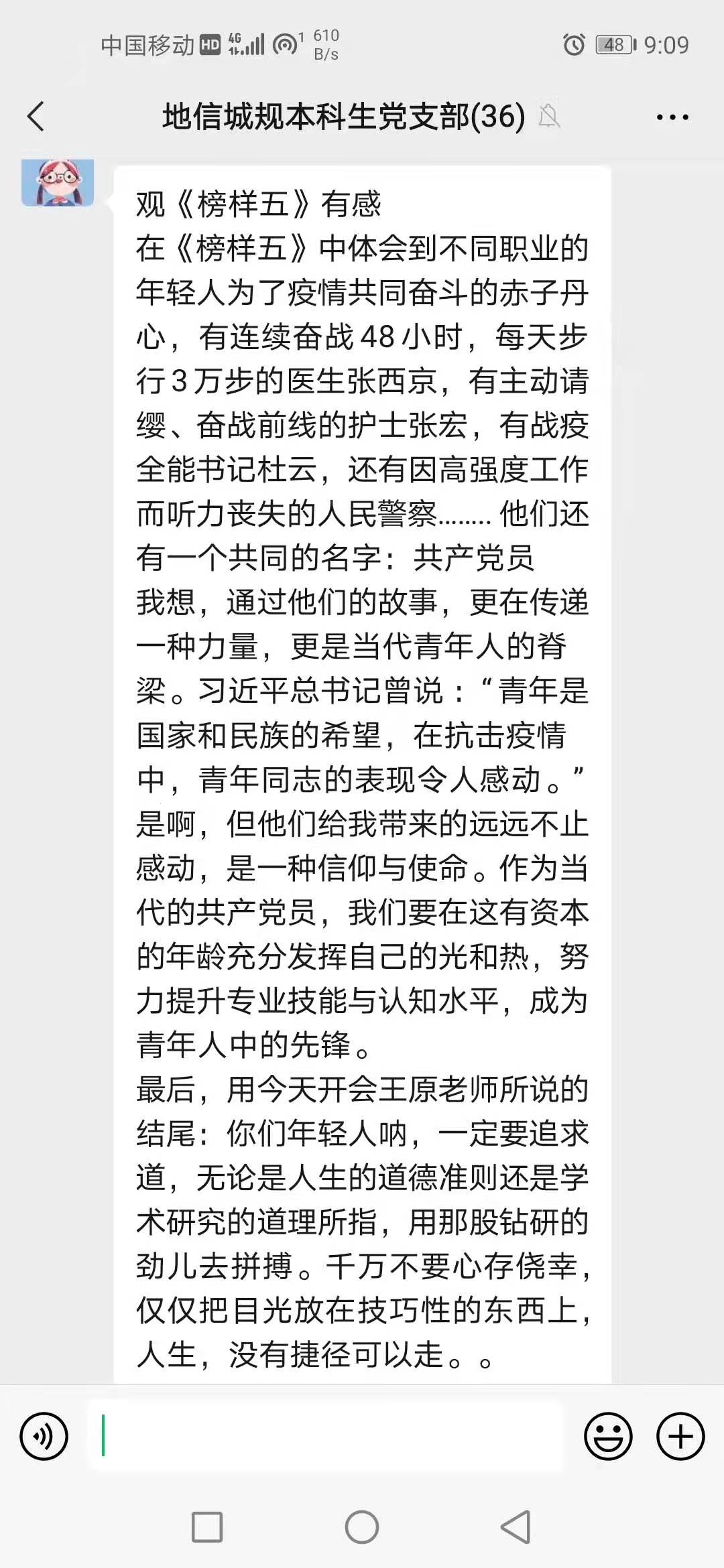 地信城规本科生党支部全体成员于3月22日观看《榜样5》专题节目,并纷纷发表自己的观后感,17地信李正妍同学写道:“我观看了《榜样5》节目,学习了2020年新冠肺炎疫情肆虐时期,不畏困难、一心为民的优秀共产党员积极抗疫的先进事迹。看完之后我感到十分震撼,也十分感动。在抗疫大战中,全国各族人民团结一心,党员干部坚守岗位、在线冲锋,广大民众英勇战斗、众志成城。面对肆虐不定的新冠病毒,各党员组织他们坚定不移,积极投身疫情防控工作,不忘初心、牢记使命、敢于斗争敢于胜利,彰显了基层党组织战斗堡垒作用和党员先锋模范作用,诠释了生命至上、举国同心、舍生忘死、尊重科学、命运与共的伟大抗疫精神,向伟大的抗疫英雄致敬!‘这世上没有从天而降的英雄,只有挺身而出的凡人’。榜样的力量是无限的,我们要向榜样学习。作为党员,通过对"抗疫精神”的学习我明白了党员要在关键时刻冲锋在前。我们要时刻牢记入党的初心和为人民服务的宗旨,把人民的利益放在第一位。我们应当具有新时代的责任和担当,始终团结在党中央的领导下,踏实努力,为未来可能面对的风雨挑战积蓄力量,为祖国的伟大复兴努力奋斗。”