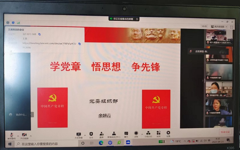 2022年4月23日上午,565net必赢客户端分党校邀请校党委组织部副部长余妍霞为必赢第12期党员培训班和第63期入党积极分子培训班学员带来了《学党章 悟思想 争先锋》的专题培训,学员们因疫情原因在腾讯会议进行学习。