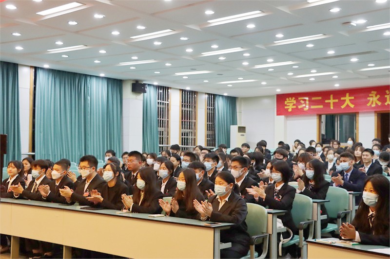 10月16日上午10时,中国共产党第二十次全国代表大会在北京人民大会堂隆重召开,习近平代表第十九届中央委员会向大会作报告。565net必赢客户端积极组织全院师生收听收看大会盛况,学院领导班子、学生党支部书记与学生党员、团员代表等100多名师生一起集中收看党的二十大开幕会现场直播,认真聆听记录,现场反响热烈,不时响起阵阵掌声。会场内党旗飘扬、红旗招展,会场后方悬挂的“学习二十大 永远跟党走 奋进新征程”红色条幅表达了师生们对深入学习领会贯彻党的二十大精神,踔厉奋发、勇毅前行的坚定信心和决心。教工党支部、各班级团支部同步组织开展线上线下收听收看活动。