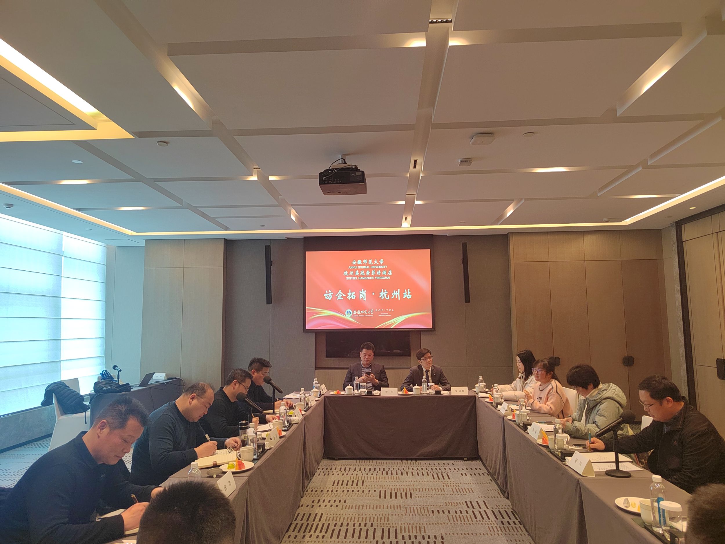 3月2日,付勇一行来到浙江英冠控股集团有限公司杭州索菲特酒店与安徽师范大学旅游管理专业校友会成员开展座谈交流。会上,杨钊介绍了旅游管理专业人才培养方案,向历届校友征询意见,校友们对现版人才培养方案给予了高度认可,认为充分考虑了行业发展需求,并结合工作经历提出了具体建议。各位校友分别向母校老师介绍了个人发展及自己所在企业单位的基本情况和人才需求,期间真挚表达了对母校、母院的感恩,并表示将积极开拓行业资源,吸纳更多优秀学弟学妹,助力专业和母校更好发展。