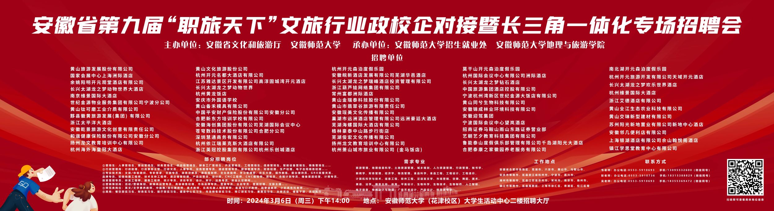 “职旅天下”专场招聘会自2013年创办至今,已成为由安徽省文化和旅游厅、安徽师范大学主办,安徽师范大学招生就业处和565net必赢客户端承办的促就业先进典型工作。此次招聘会吸引了来自全国各地的70余家企业前来招聘,提供岗位1600多个,涉及文化、旅游、教育、科技等多个门类,涵盖国内外知名酒店集团、景区、地产、规划、咨询、会展、旅行社、教育机构、互联网科技等多个业态。