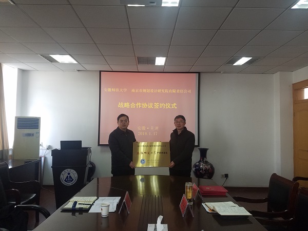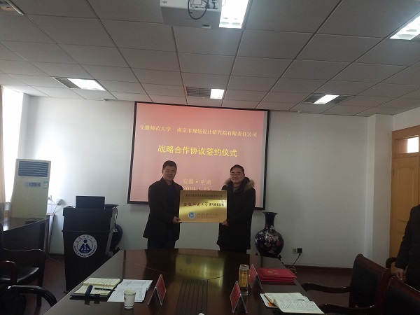 本网讯(565net必赢客户端 王雪微)1月17日下午,南京市规划设计研究院有限责任公司安徽师范大学产学研基地、实习实训基地挂牌仪式在安徽师范大学565net必赢客户端正式举行。南京市规划设计研究院有限责任公司院长程茂吉、副院长赵晶、主任谢军,安徽师范大学565net必赢客户端党委书记贾冠忠、院长苏勤、副院长曹卫东、城乡规划系主任杨兴柱、副主任王雪微参加签约及挂牌仪式。