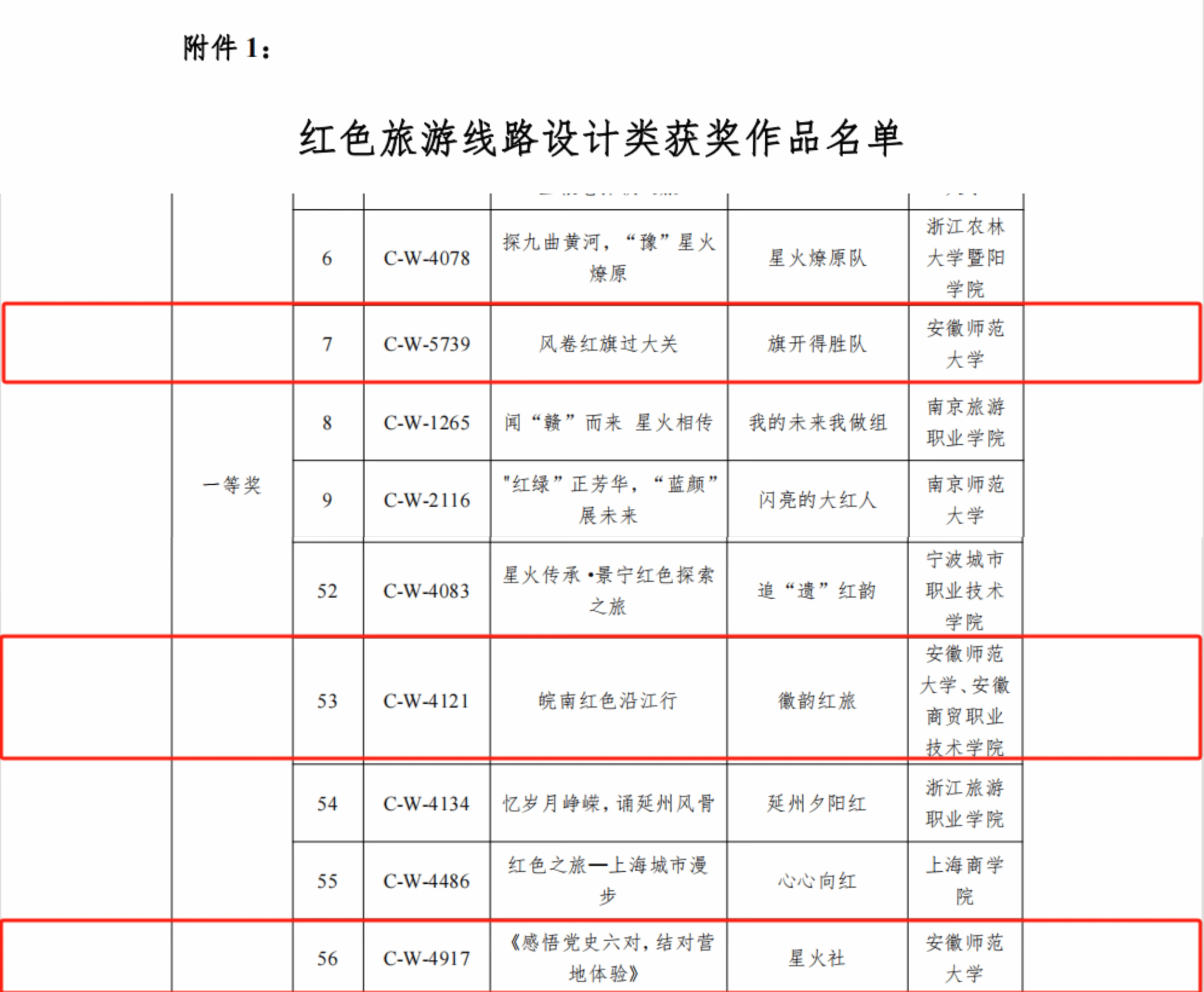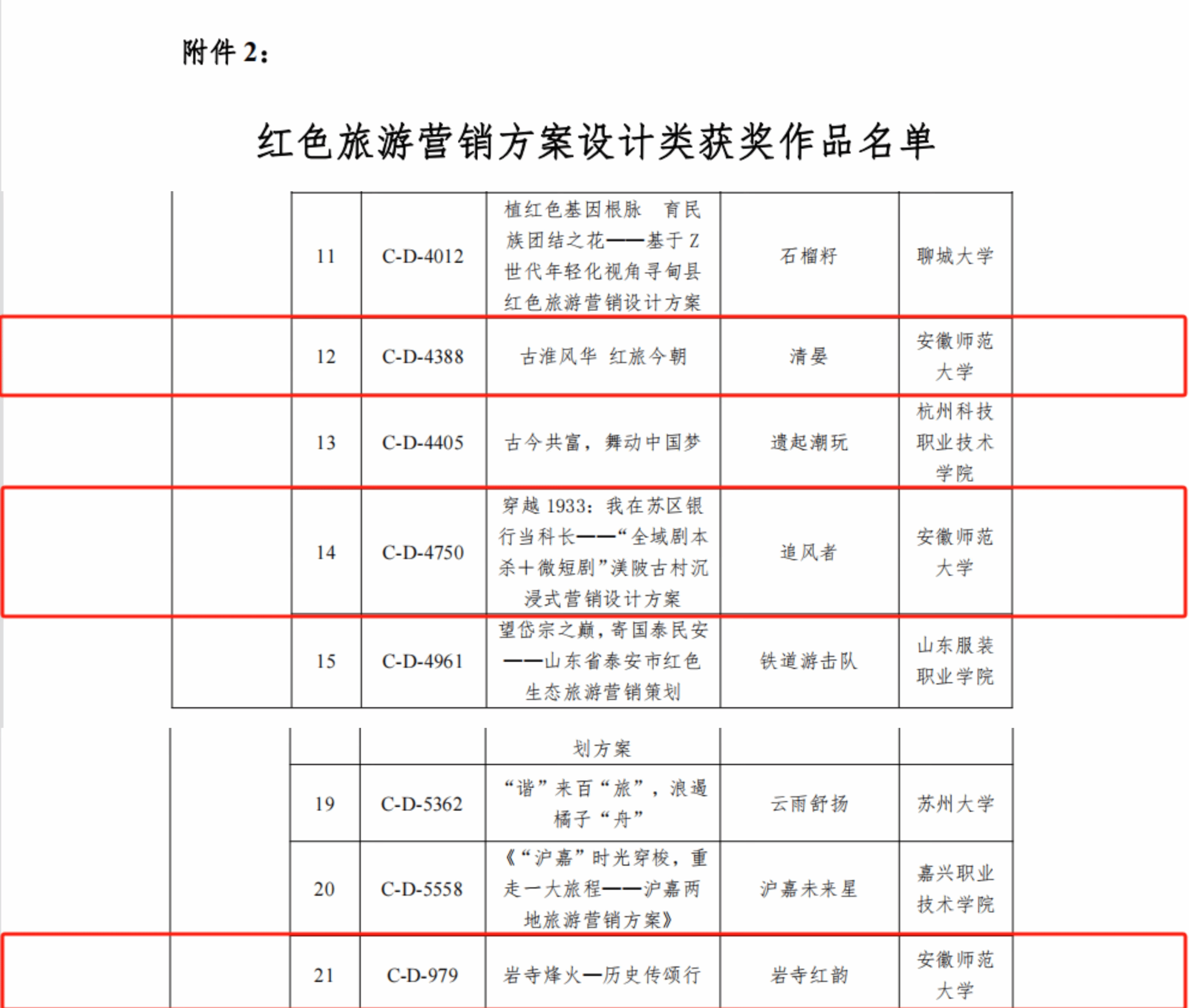 本网讯(谢园)近日,由文化和旅游部资源开发司、国家发展改革委社会发展司、共青团中央宣传部等多个部门联合主办的第十四届全国大学生红色旅游创意策划大赛落下帷幕。由指导教师杨效忠、杨钊、王群、尹寿兵、王莉、洪学婷指导的6支队伍“旗开得胜队”“徽韵红旅”“星火社”“清晏”“追风者”“岩寺红韵”斩获华东赛区一等奖,其中谢美晶、申楷辰、傅豪、张婉婷、徐瑾、李馨怡等同学表现优异。
