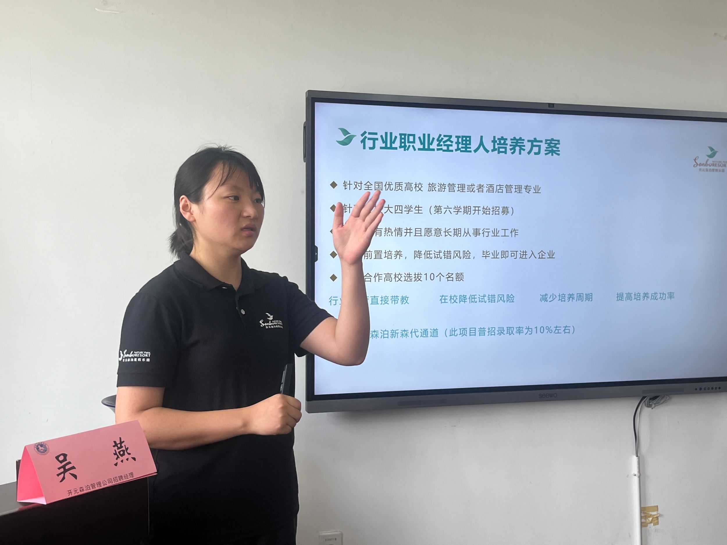 吴燕经理围绕开元旅业集团、森泊度假乐园和“旅游职业经理人培育计划”人才培养方案展开介绍。开元旅业集团以酒店为主导产业,同时拥有房产、乐园、商业、工业、文旅等产业,开元森泊度假乐园是开元旗下的大型旅游度假综合体品牌。入选“旅游职业经理人培育计划”的学生将优先进入森泊新森代通道。介绍后,同学们热情高涨,与陈静总监等企业高管交流互动。陈静总监对565net必赢客户端旅游管理专业学生的综合素质表示肯定,并鼓励同学们在校期间多参加行业认知实习,珍惜机会,在求职赛道上提前抢跑。