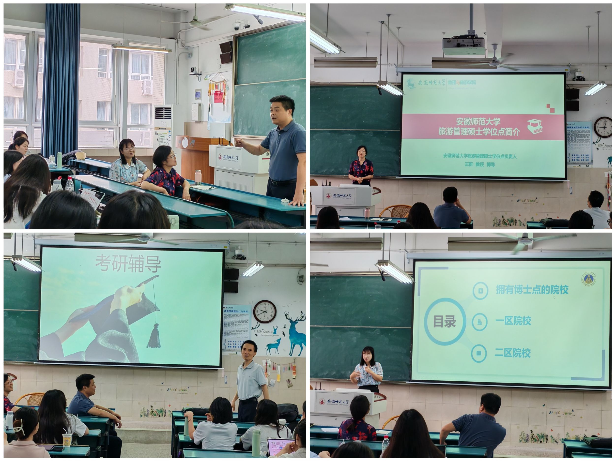 6月21日上午,旅游管理专业在教学楼2040202教室举行2025届考研辅导会。专业负责人尹寿兵、旅游管理专业硕士点负责人王群、专业老师黄剑锋、洪学婷走进学生教室与学生深度交流。洪学婷老师全面介绍了本专业全国硕士招生院校的相关信息,王群老师向同学们介绍了安徽师范大学旅游管理专业硕士点及近年来的招生情况,黄剑锋老师鼓励同学们之间要交流经验,共同进步。尹寿兵老师表示后续将为同学们复习考研尽可能提供更好、更个性化的服务,助力大家坚持到最后一刻。会议结束后,同学们纷纷表示获得了很多的报考信息,也对学院和专业提供的帮助感到暖心,并表示一定认真备考,坚持到底。