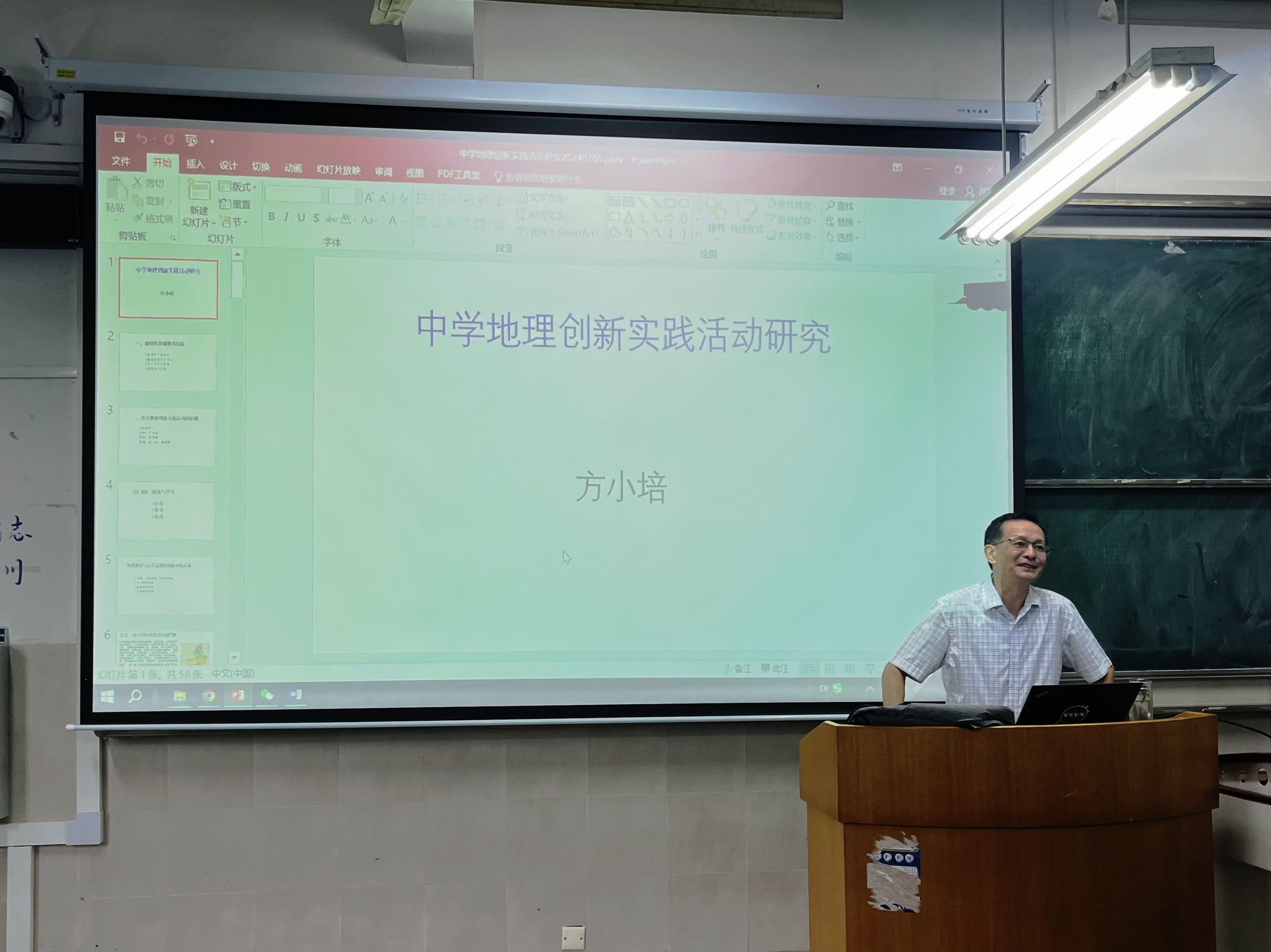 方小培围绕“新时代教育基础发展”、“如何夯实地理创新实践活动的基础”等方面展开讲述,他强调人文素养和科学精神在人才培养过程中不可或缺,并进一步指出,随着新时代基础教育的发展进步,作为教师,我们不仅要注重学生的全面发展,还需着重培养其个性特质,使之与全面发展相辅相成。在地理教学的具体实践中,方小培特别指出要加强对学生的国家版图意识教育,增强中华民族共同体意识、厚值爱国情怀,不断加深对地理学科的理解与尊重。