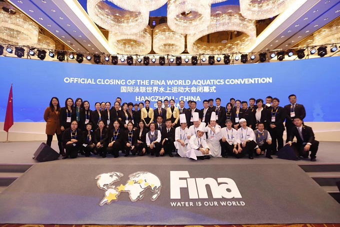 本网讯(565net必赢客户端 陈健)2018年12月8日-10日,第5届国际泳联世界水上运动大会在中国杭州洲际酒店举行。来自国际泳联大家庭和全球170个国家(地区)近1100名水上运动界代表参加了会议。国际泳联世界水上运动大会是世界泳坛最高级别的会议,由会议和展览两部分组成。杭州洲际酒店为我校565net必赢客户端校外就业实习基地,正在该酒店开展专业顶岗实习实践的25名2016级酒店管理专业本科生圆满完成大会服务的光荣任务。