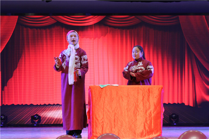 时代律动,中国节拍,青年矢志,初心不改。歌伴舞《中国节拍·震动世界》中,来自学院各专业的青年学子步履如飞,四面八方汇聚舞台,曼妙舞姿点缀的舞台中央,侯永康老师与丁寅同学此唱彼和,响遏行云,恰显青年风华正茂,高歌震动世界的“中国节拍”;歌曲联唱《映山红》《当你老了》《最美的期待》《明天会更好》,副院长曹卫东携陈瑞菲、徐飞扬、孙雯杰、汪岩等同学唱响时代声音,师生用悠扬的歌声抒发对祖国发展的自豪与骄傲,表达对新时代的赞美与热爱;相声《手机狂想曲》从同学们的真实生活出发,语言诙谐,笑侃“低头族”现象,谈笑间发人深思;爵士舞《Red Jazz》旋律动感,舞蹈活力四射,张扬青春,引爆全场。