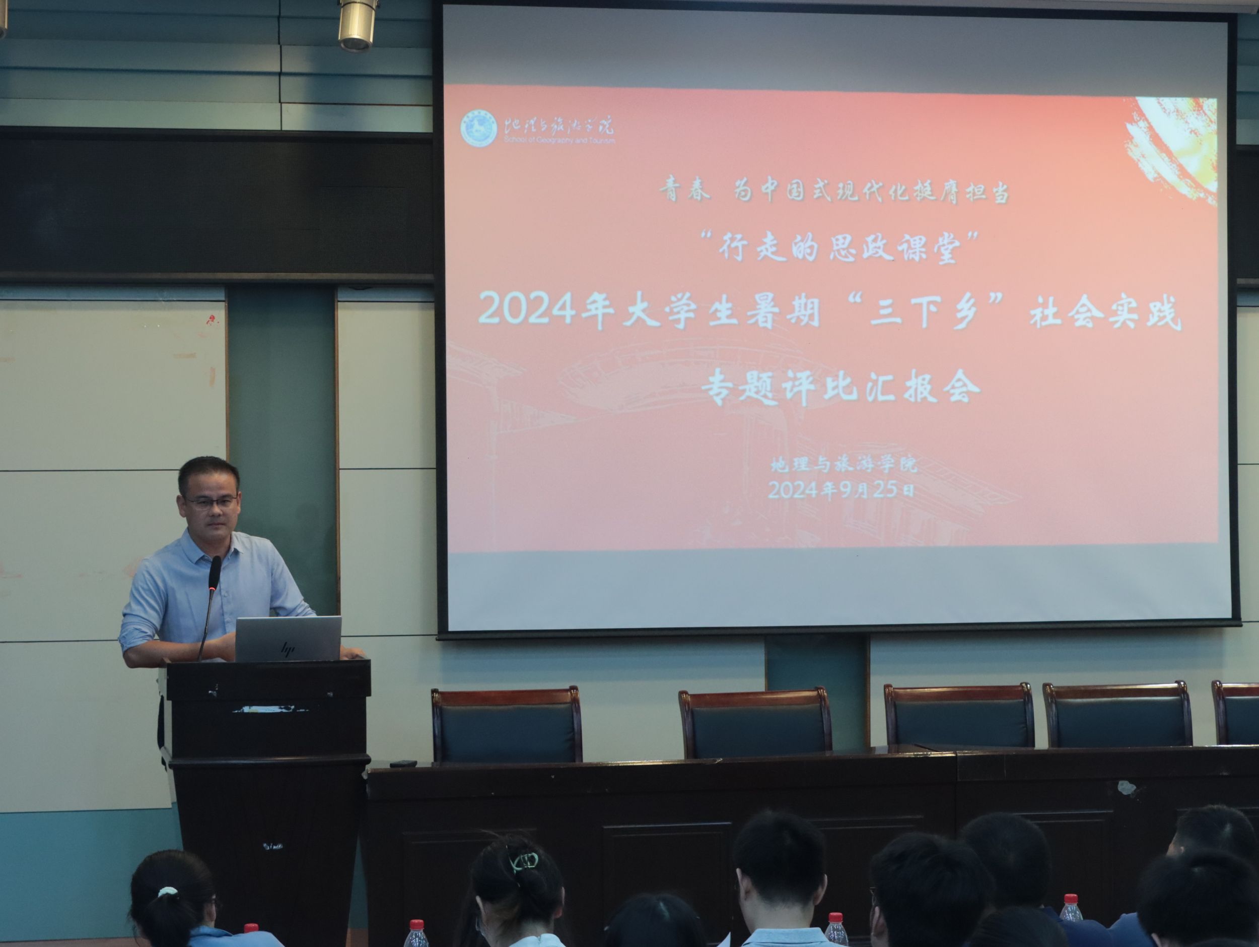 为落实好“大学生护航行动计划”,进一步总结2024年暑期社会实践成果,切实推进实践宣传和成果固化,检验实践育人成效,2024年9月25日下午,565net必赢客户端在实验楼101报告厅开展“行走的思政课堂”2024年大学生暑期“三下乡”社会实践专题评比汇报会。学院党委副书记付勇、地理科学专业教师徐仪红、旅游管理专业教师洪学婷、土地资源管理专业教师梁栋栋、城乡规划专业教师王原、地理信息科学专业教师季青、团委书记韦银艳以及专兼职辅导员代表担任本次会议评委,实践团队成员和各班级学生代表观摩学习,汇报会由2023级旅游管理专业学生刘乐主持。
