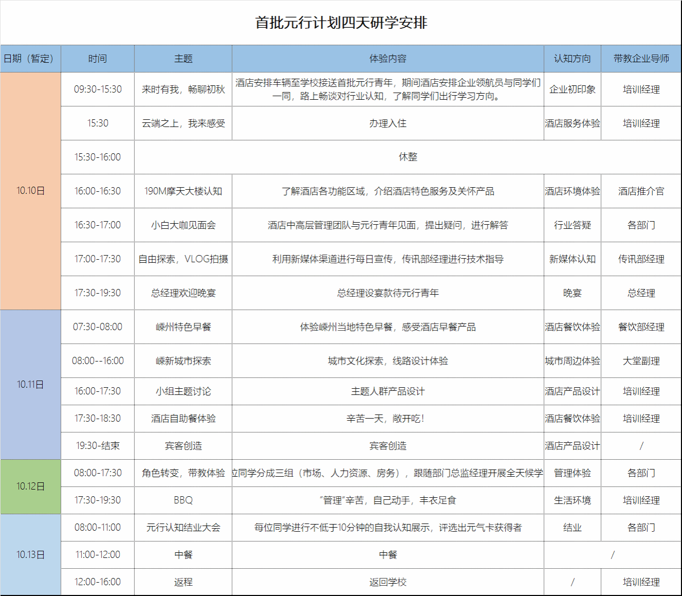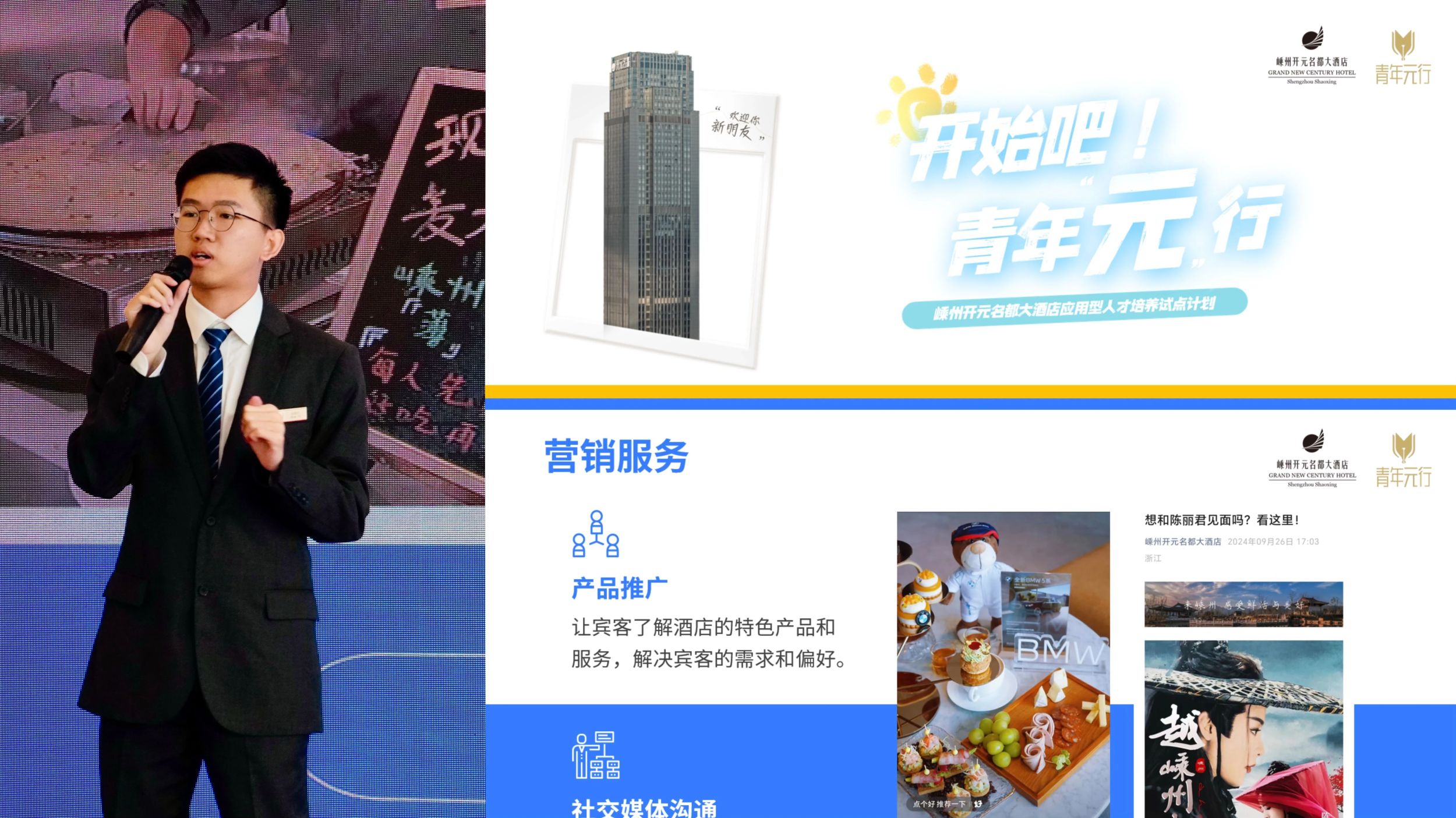 “元”行计划中的最大亮点,是嵊州开元名都大酒店通过招募大二(对行业感兴趣、前置意识培养)及大四(就业选择)的优秀同学开展为期四天三晚的行业探索,同学在此过程当中,各自发挥创意,以新鲜血液带动产品品质年轻化,让活力留在城市地标。此次“开始吧,青年元行”计划行程中,五位同学通过镜头记录下了自己的所思所感所想。同时酒店设置多轮考核,让同学们充分利用新媒体进行“自我营销”,目的也是为了让同学们在认知阶段便对线上新媒体渠道的玩法及基础操作进行培养,在后续实际工作中,能够充分将媒体思维+酒店工作融合创新。