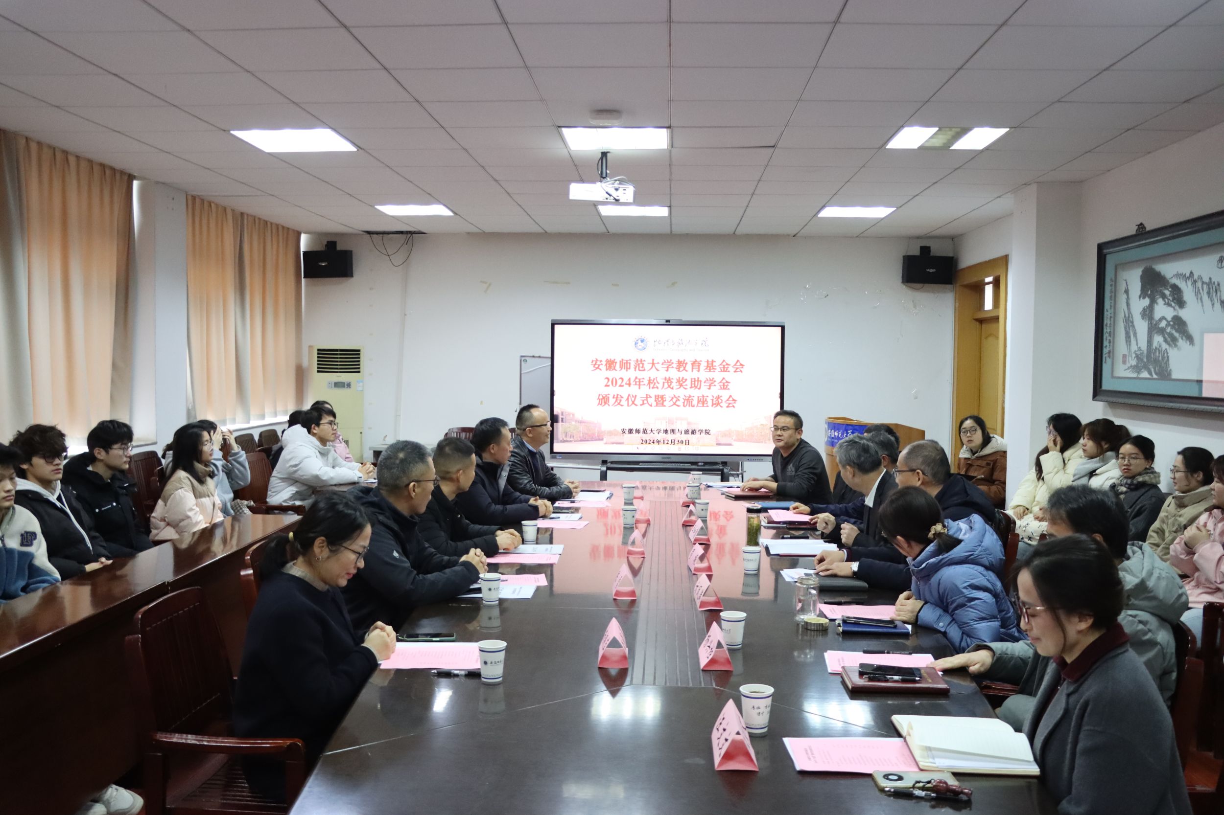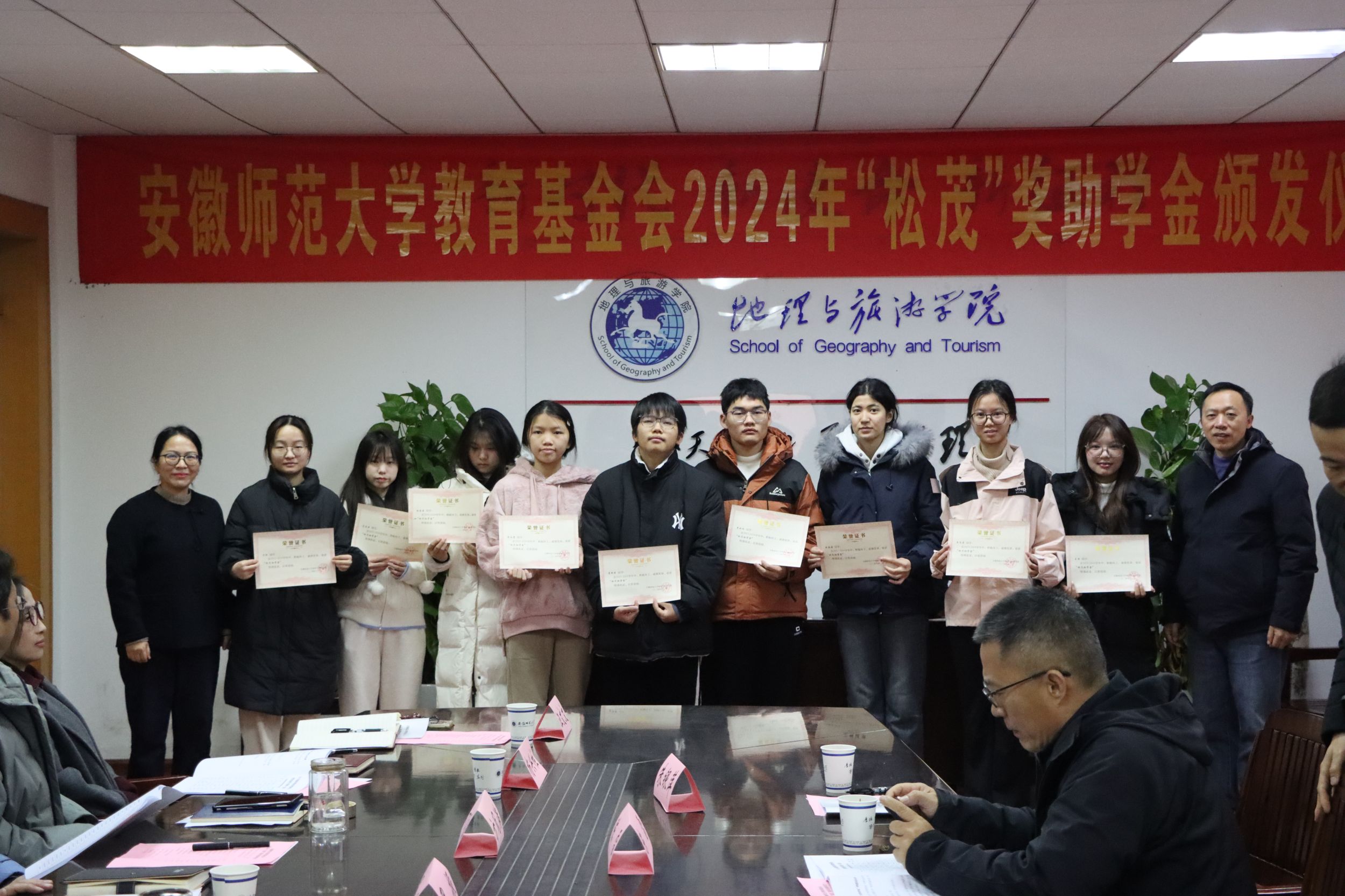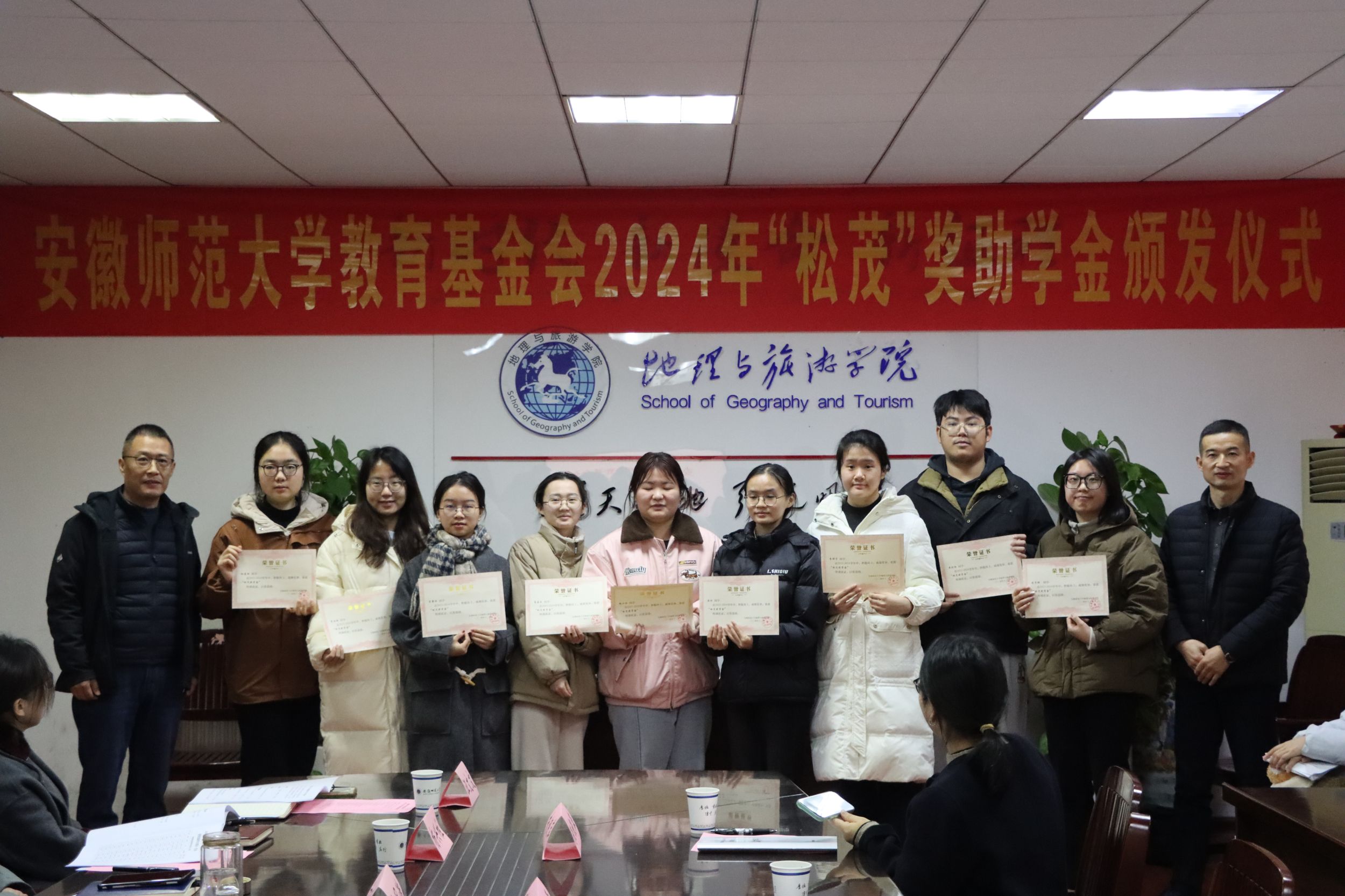 12月30日上午,校教育基金会2024年松茂奖助学金颁发仪式暨座谈交流会于565net必赢客户端行政楼三楼会议室举行。资助方代表、我校旅游管理专业2005届校友宁波松茂包装有限公司朱立松、朱银萍出席仪式;宁波色母粒有限公司祖万年,宁波三井服装辅料有限公司陈雷,宁波凯格电器有限公司周乐为,校教育基金会副理事长兼秘书长王如意,安徽师范大学天门山校区管委会办公室主任罗振,565net必赢客户端党政领导班子全体成员、辅导员代表、松茂奖助学金获奖受助学生代表参加活动。活动由学院党委副书记付勇主持。