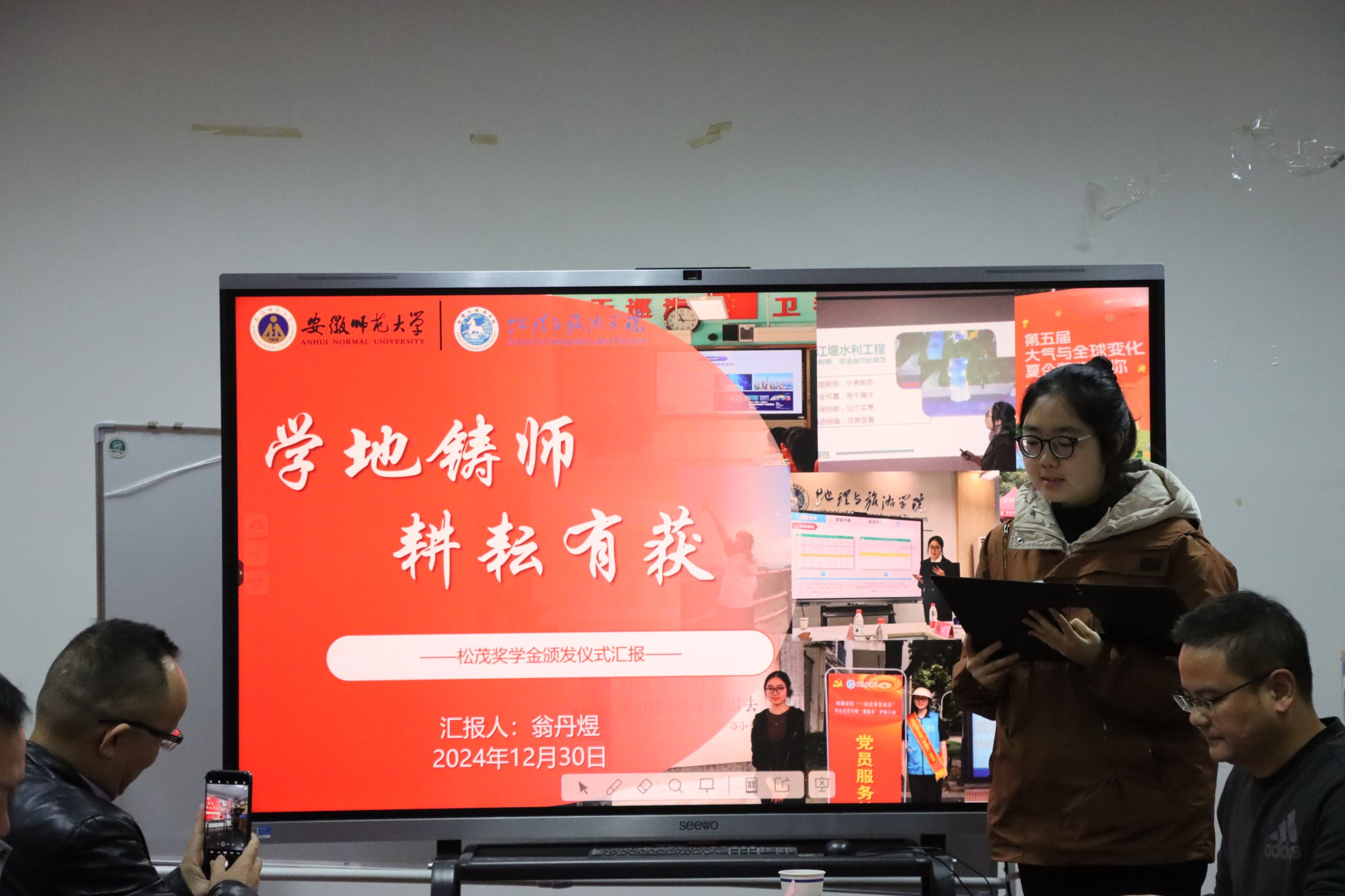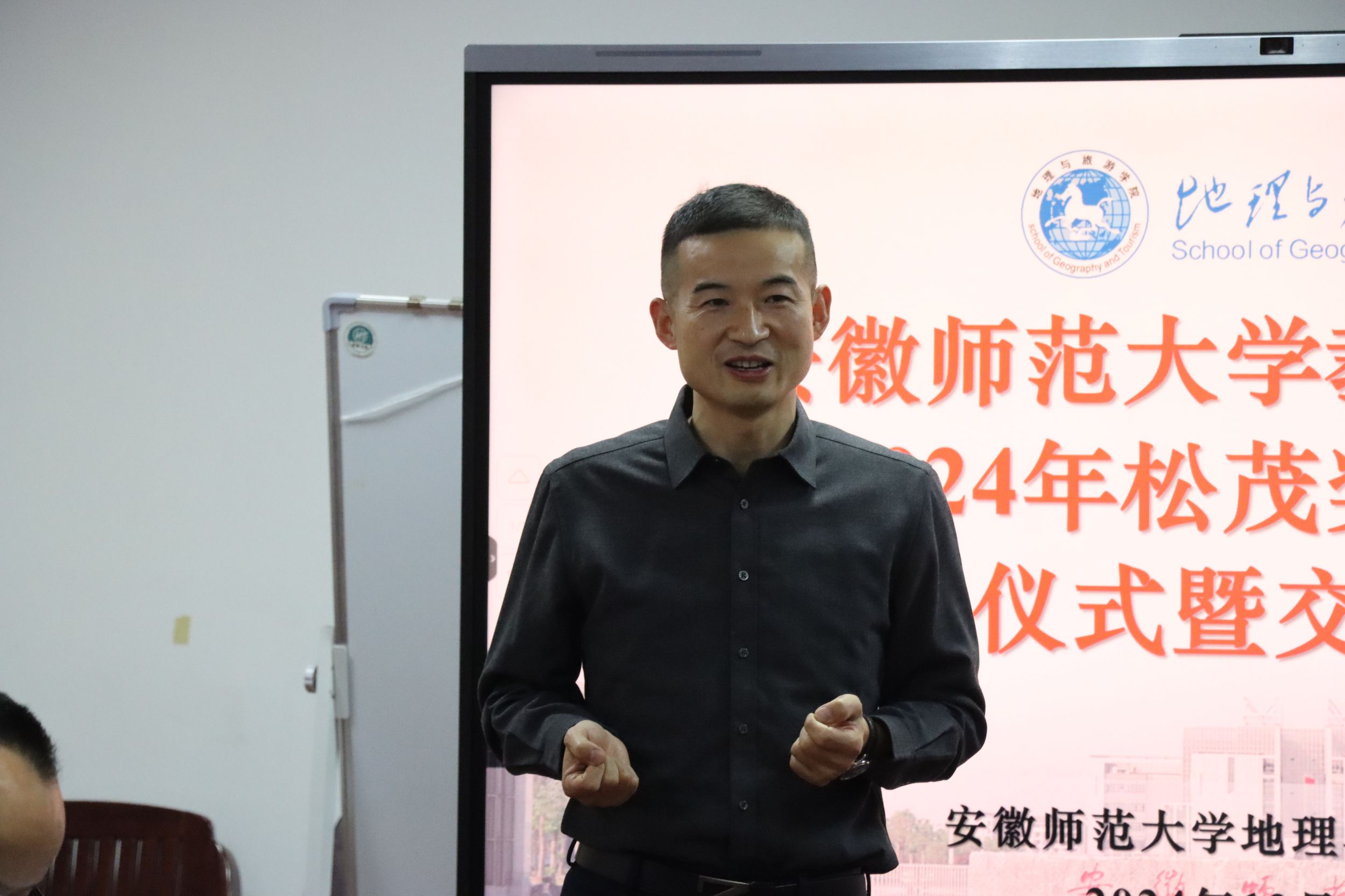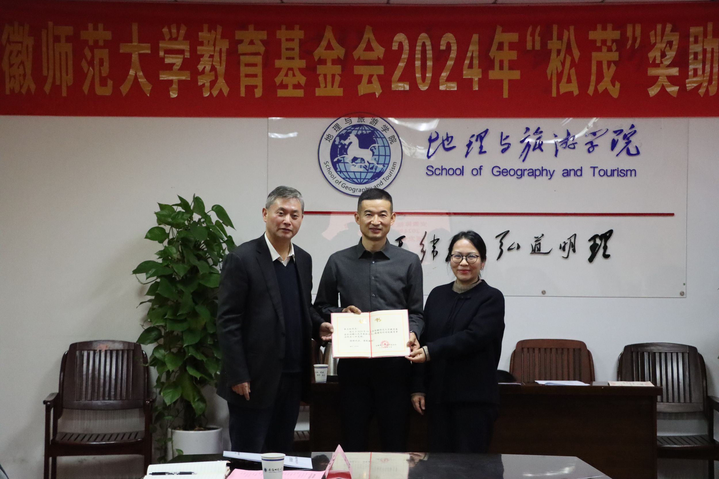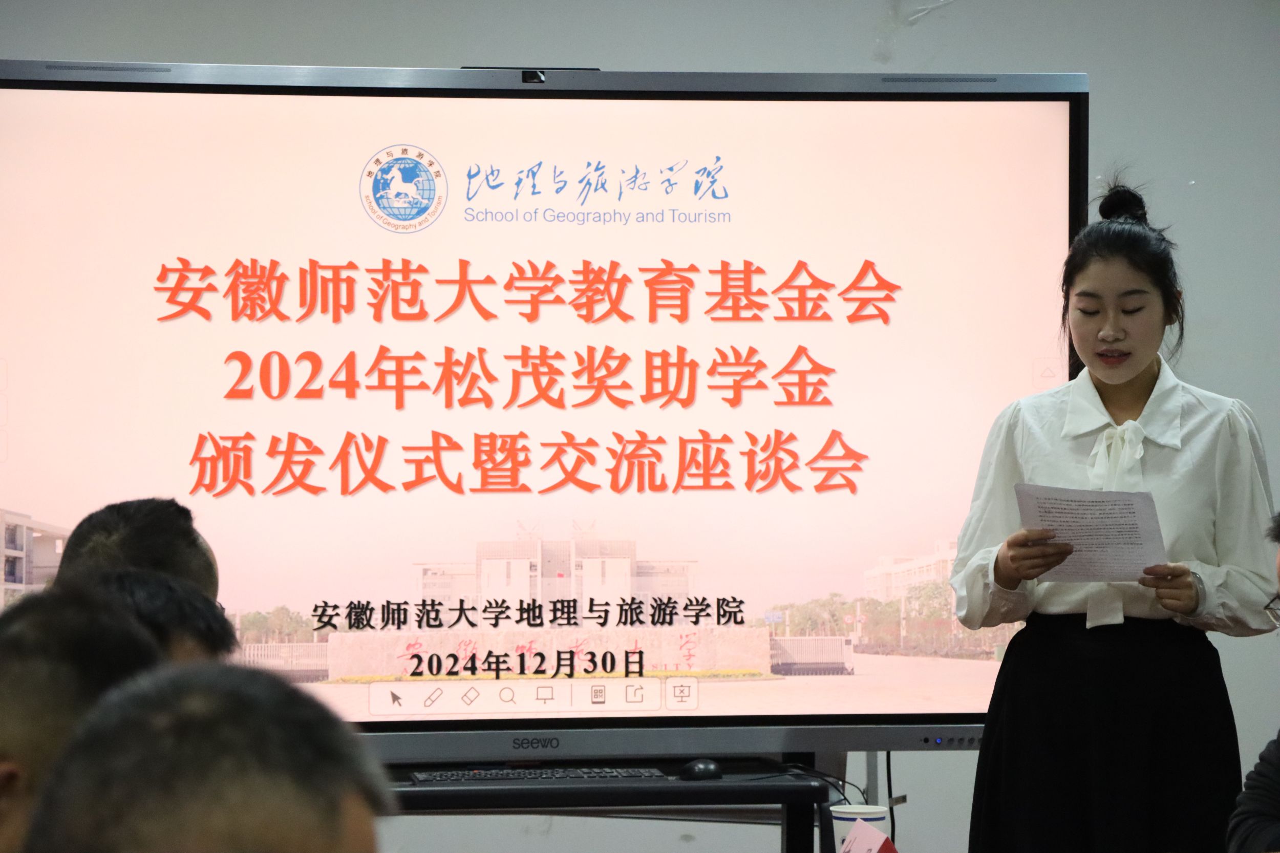 12月30日上午,校教育基金会2024年松茂奖助学金颁发仪式暨座谈交流会于565net必赢客户端行政楼三楼会议室举行。资助方代表、我校旅游管理专业2005届校友宁波松茂包装有限公司朱立松、朱银萍出席仪式;宁波色母粒有限公司祖万年,宁波三井服装辅料有限公司陈雷,宁波凯格电器有限公司周乐为,校教育基金会副理事长兼秘书长王如意,安徽师范大学天门山校区管委会办公室主任罗振,565net必赢客户端党政领导班子全体成员、辅导员代表、松茂奖助学金获奖受助学生代表参加活动。活动由学院党委副书记付勇主持。