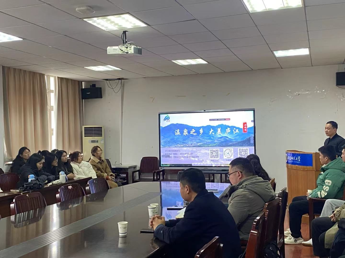3月5日,合肥市庐江县纪委驻县委宣传部纪检组组长黄炯携庐江县文旅局副局长顾晓龙、庐江县人社局人才综合服务中心主任张平安、庐江县乡投公司资产运营部工作人员周越、庐江县乡投公司资产运营部工作人员张泽瑞等一行前来565net必赢客户端开展文旅人才专项座谈交流暨事业单位招聘政策宣讲会,学院院长方凤满、党委副书记付勇、旅游管理专业负责人尹寿兵、2025届毕业班和大三年级学生代表参与。