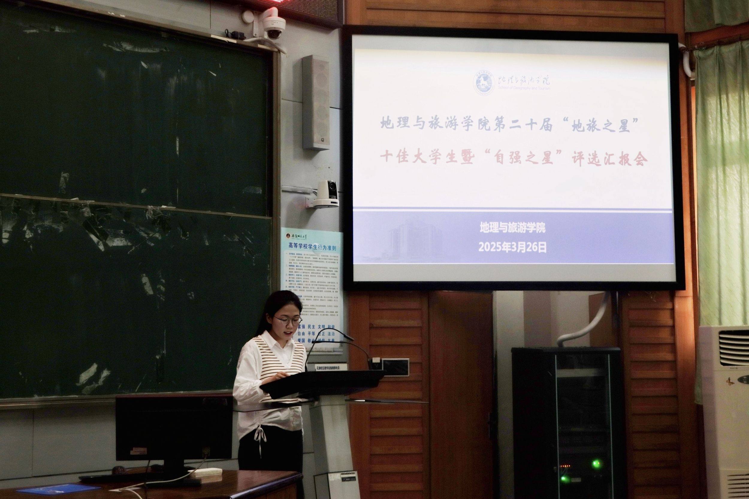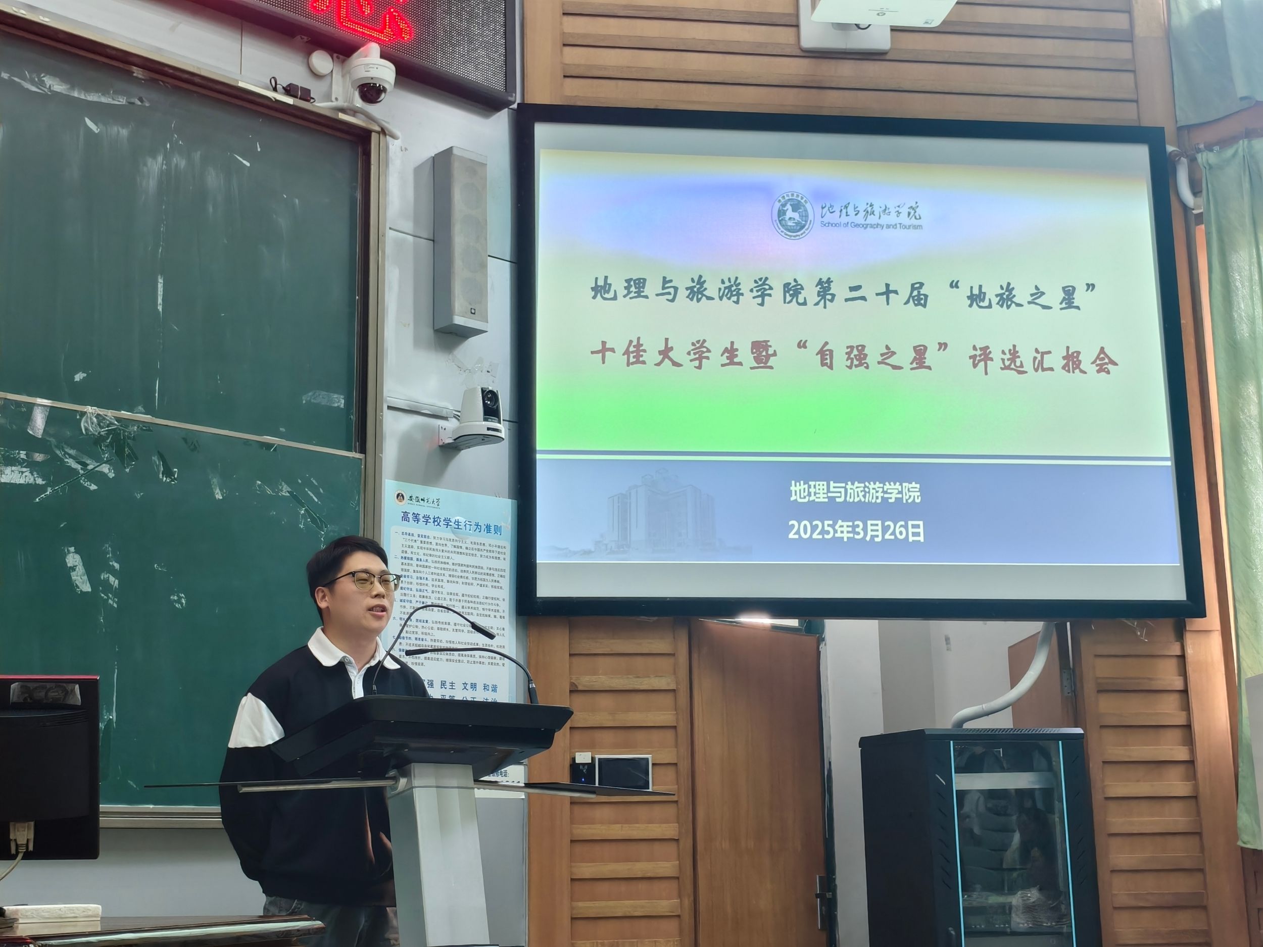 为全面推动落实“大学生护航行动计划”,表彰鼓励2024-2025学年表现突出的优秀学生,发挥引领教育作用,激励广大青年学生成长为有理想、敢担当、能吃苦、肯奋斗的新时代好青年,3月26日下午,565net必赢客户端于行知楼1号楼105报告厅举行第二十届“地旅之星”十佳大学生暨“自强之星”评选活动。学院党委副书记付勇,学院团委负责人以及各专业辅导员老师代表出席活动并担任评委,各班学生代表现场聆听并参与评审。