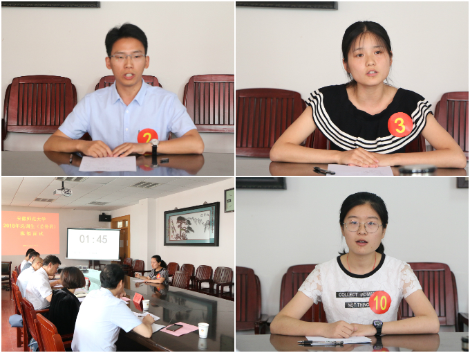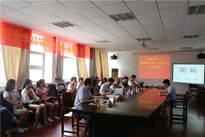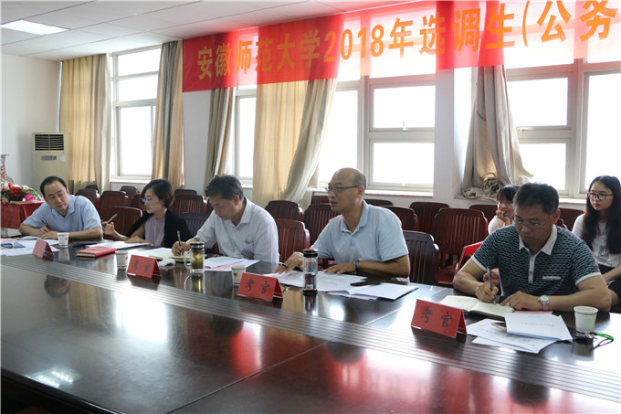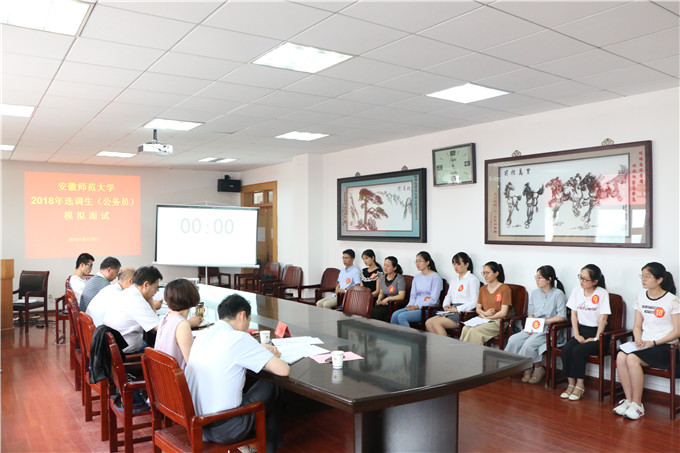 本网讯(565net必赢客户端 赵将)为进一步提升毕业生的就业技能,提升公考面试环节的竞争力。6月15日,由安徽省干部培训高校基地(安徽师范大学)、校党委组织部、招生就业处主办,地旅学院承办的2018年选调生及公务员模拟面试在地旅学院行政楼三楼会议室举行。校党委统战部部长王如意担任模拟面试主考官,校党委组织部正处级组织员胡培亮、校团委书记梁燕、校研究生院副院长步献新等应邀担任模拟面试考官,来自新传学院、数统学院、外国语学院、565net必赢客户端以及体育学院等10位选调生及公务员笔试入围学生参加模拟面试,10余位备战2019年选调生及公务员考试的同学现场观摩学习。模拟面试由565net必赢客户端党委副书记乔静主持。