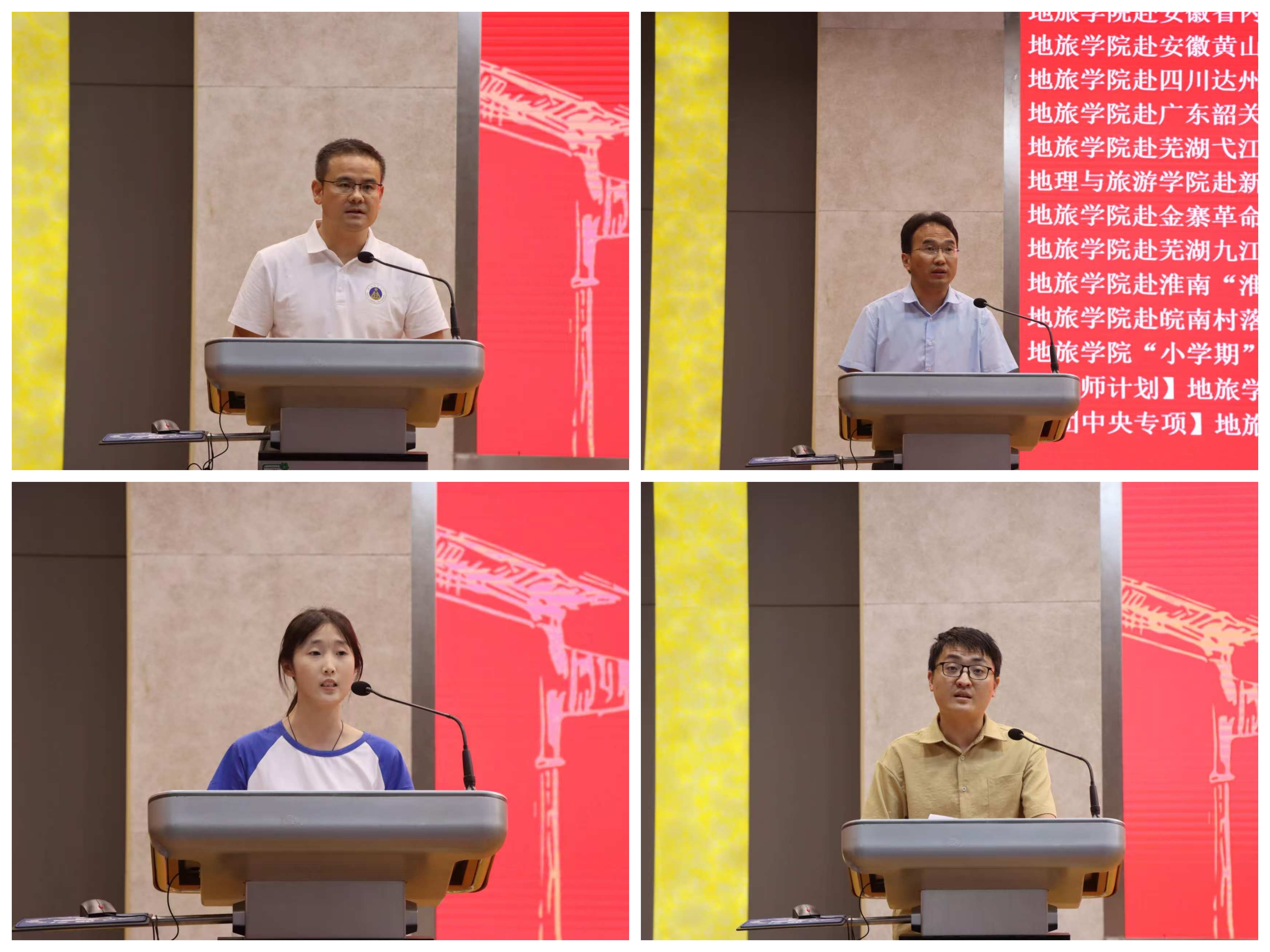 活动在庄严的国歌声中拉开帷幕。付勇介绍了本年度暑期社会实践工作概况,学院围绕实践育人目标,学院共组建了42支团队,共有579名学生、59名专业教师参与本次暑期社会实践活动,涵盖支教、红色教育、科普等多个方向。杨兴柱宣读了2025年暑期社会实践校级和院级重点团队名单,经过自主申报、学院审核、集中答辩、学校评审等环节,最终评选出了团中央专项团队2支,校级重点团队13支,院级重点团队13支。2023级旅游管理专业程家琪作为学生代表发言,深情讲述了学院"川队"18年来扎根乡村、服务基层的感人事迹。指导教师代表姜伟在发言中勉励同学们要将专业知识转化为实践能力,在社会大课堂中锤炼本领。