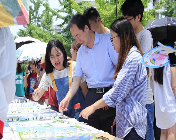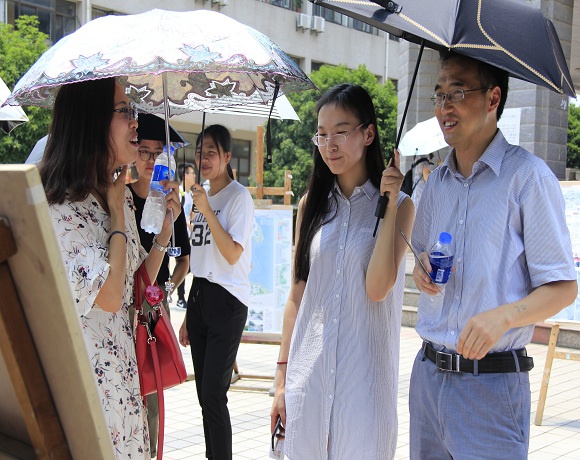 在展览期间,乔静在观看作品时,与在场同学亲切交流,不断地询问他们有关作品的创意与制作过程,他对此次的展览给予了充分的肯定,鼓励城乡规划的同学继续努力,要在老师的指导下,取得丰硕的成果。城乡规划专业各授课老师在展览现场观看和指导作品时,副教授李俊峰就对在场同学们指出:“做城市设计,不要拘泥于对功能安排,要更多的考虑人这个因素,城市设计要以人为本。”最后他对同学们建议在设计方案时要考虑到灵活、适用、实用的原则,实现“城市让生活更美好”的终极目标。