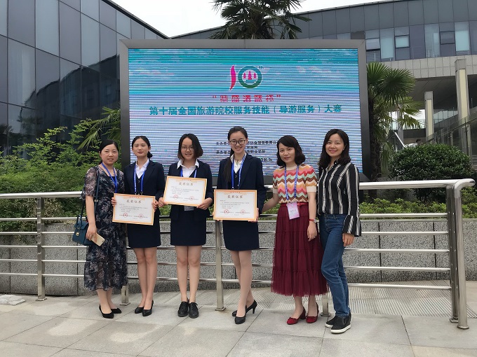 本届大赛共有来自全国31个省、自治区、直辖市的371所高等院校和中职学校的1160名选手报名参赛,众多院校派出代表观摩、学习和交流。大赛分为高等院校、中职学校两个组别,设置普通话导游服务、英语导游服务两个赛项,从理论考核、中英文导游讲解和才艺展示三大环节展开了角逐。大赛聘请61位权威专家担任裁判,并经过大赛组委会裁判组规范的评分程序,根据选手的导游讲解技能、思维逻辑、形象气质等多方面进行综合评分。来自565net必赢客户端的四位参赛选手从开学初便开始认真准备,学院秉承“以赛代训、以赛促学”的专业素养培养理念,由王咏、吴悦、刘云霞等三位老师全程担任指导老师,围绕比赛的各个项目和细节进行全方位指导,与选手一同前往杭州比赛现场,给予专业指导,关心选手生活,帮助调节情绪。四位同学则从容应战,以专业娴熟的讲解、优雅从容的姿态获得评委组的一致好评。