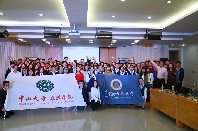 晚上19:00,当夜幕降临的时候,中山大学旅游学院师生受邀参加中山大学-安徽师范大学本科生校际联谊会。中山大学旅游管理与规划系主任左冰副教授、副主任刘逸博士、国旅学院党委副书记乔静等领导老师出席了联谊会,两校学生相间而坐,以更加轻松活泼的形式深入交流。两校2015级旅游管理专业的班长分别为对方佩戴上自己学校的校徽,象征着长江之滨的师大学子和珠江之畔的中大学子结成互信互助的朋友。随后,两校师生将精心准备的文艺节目一一呈现,国旅学院精心准备的茶艺节目《高山流水》博得满堂彩,一壶清茶用以招待远方来访的朋友;安徽师范大学礼仪队的姑娘们踏着音乐的节拍展示出我校学生的礼仪风采,引出掌声经久不息;中山大学旅游学院的同学们带来了粤语经典歌曲《红日》、法语歌曲《Je M’appelle Hélène》和英文歌曲《Radioactive》,观众的节拍合着旋律的起伏,气氛热烈。联谊会在中山大学旅游管理与规划系副主任、硕士生导师刘逸老师和我校国旅学院团委副书记吴辉老师合作的吉他弹唱《外面的世界》中达到了高潮。当两校师生合唱安徽师范大学校歌和中山大学校歌时,联谊会在动人的氛围中缓缓落幕。