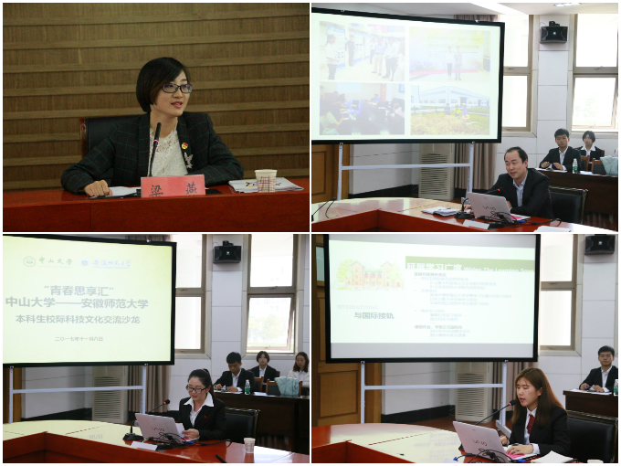 为推动我校与兄弟高校优秀学子交流学习,扩大我校国旅学子的学术科技文化视野,国旅学院在全校率先创立了“青春思享汇”本科生校际科技文化交流沙龙活动品牌,本期活动以国旅学院2015级旅游管理专业为主体,与中山大学旅游学院2015级本科生在专业学习、学科竞赛、社会实践开展对话交流。下午14:30,首届“青春思享汇”中山大学-安徽师范大学本科生校际科技文化交流沙龙活动在花津校区会议中心第一会议室正式拉开帷幕。校团委书记梁燕、国旅学院党委副书记乔静、中山大学旅游管理与规划系副主任、硕士生导师刘逸以及中山大学旅游学院和我校国旅学院旅游管理专业本科生参加了本次活动。活动由学院团委副书记吴辉主持。