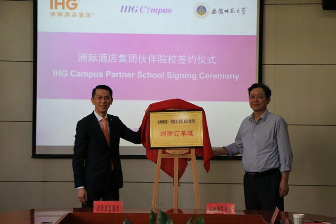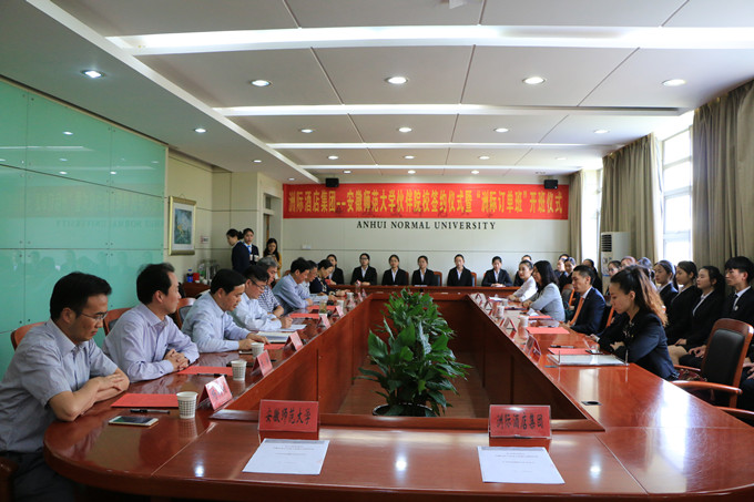 本网讯(国旅学院 刘冠琪 赵将)人才定制培养,校企合作双赢。5月16日下午, 洲际酒店集团-安徽师范大学伙伴院校签约仪式暨“洲际订单班”开班仪式在校行政楼一楼第一会议室顺利举行。洲际酒店集团大中华区校园资深项目合作经理胡晓,杭州洲际酒店总经理李国雄,人力资源总监吴青艳,校党委常委、副校长朱家存,教务处处长席贻龙,杭州洲际酒店人力资源部相关领导、国旅学院领导班子成员、相关专业负责人、教师代表及国旅学院2016级酒店管理专业“洲际订单班”全体同学参与了本次仪式,签约仪式由国旅学院副院长王朝辉主持。