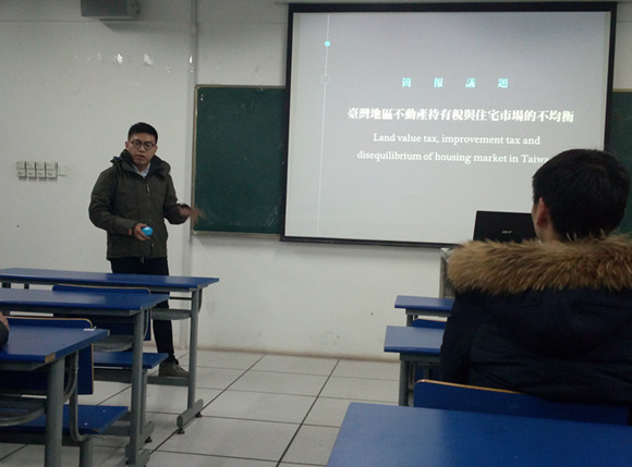 2017年3月2日晚,台湾逢甲大学林圣豪博士应邀在必赢实验楼202教室,作了题为“台湾地区不动产持有税与住宅市场的不均衡”的学术讲座。相关专业老师及研究生、本科生聆听了报告。