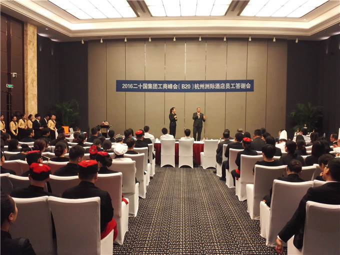 杭州国际会议中心、洲际酒店是本次B20峰会开幕式、会议及晚宴的承办方,杭州洲际酒店是G20峰会官方指定接待酒店。我校作为杭州国际会议中心、洲际酒店的校企合作单位,早在2015年12月,就配合峰会组委会和承办方开展了学生服务团队的招募、培训工作,16位同学通过层层筛选,在半年多的时间里接受了组委会高强度的培训,圆满完成了峰会服务工作。答谢会上,Frankson lee代表峰会承办方对我校的人才培养质量予以高度肯定,并对我校在峰会筹办期间的大力支持及对参与服务同学们的辛勤付出表示衷心感谢;朱云夫在会上以“记得、值得、懂得”三个关键词回顾了峰会筹办的艰辛历程,并引用习近平总书记在五四青年节纪念活动上关于“青春”的寄语勉励同学们,要把服务B20峰会的宝贵经历作为人生财富激励自己努力前行;陈晓代表峰会承办方为我校颁发了荣誉牌匾。