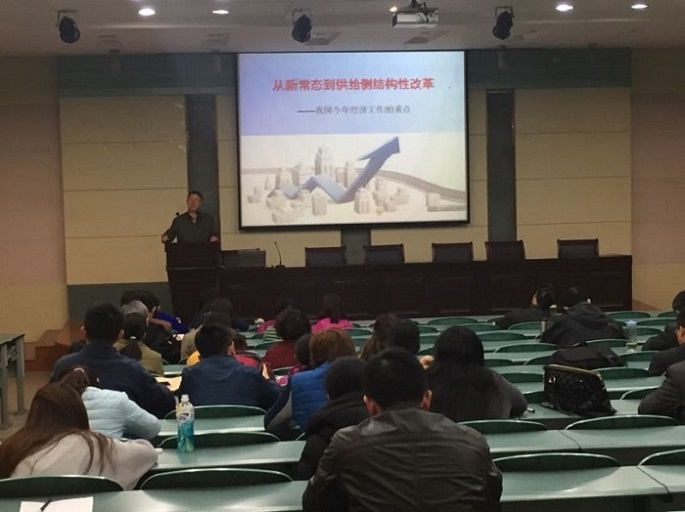 党的十八大以来,习近平总书记高瞻远瞩,统揽全局,深思熟虑,提出了治国理政的新思想、新理念、新战略,并从我国经济发展的阶段性特征出发,形成了具有重大指导性、前瞻性、针对性的经济工作系列论述。在这种社会经济新常态背景下,贾冠忠书记从“新常态下的供给侧结构性改革内涵”、“推进供给侧结构性改革的主要内容和行动方案”、“2016年供给侧结构性改革的五大任务”三个方面详细解读了供给侧改革,将供给侧改革的政策含义、背景进行了普及,重点指出推进供给侧结构性改革是适应和引领经济发展新常态的重大创新。最后,贾冠忠书记给全体教职工布置了“家庭作业”,希望大家能进一步学习相关背景政策,把握住国家经济、社会的发展的方向,同时在教育教学过程中给学生指引正确的奋斗方向。