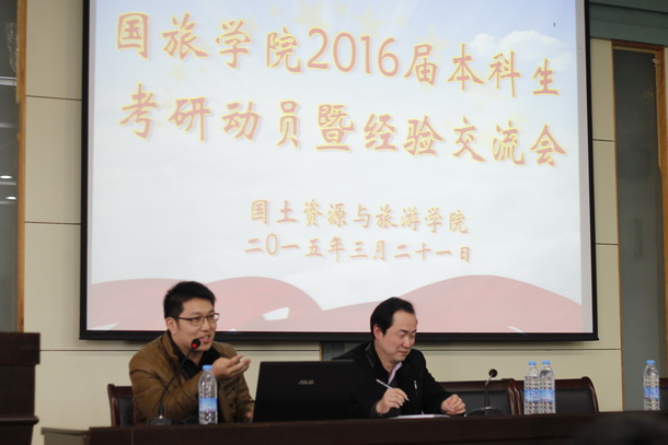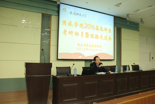 为尽早启动2016届本科生考研工作,做到早动员、早部署、早行动,3月21日下午14:00,必赢在实验楼101报告厅举行2016届本科生考研动员暨经验交流会,大会由院党委副书记乔静主持,副院长苏勤、地理系本科生导师孙鹏、部分985高校研究生、辅导员及全体12级本科生与部分低年级同学参加会议。