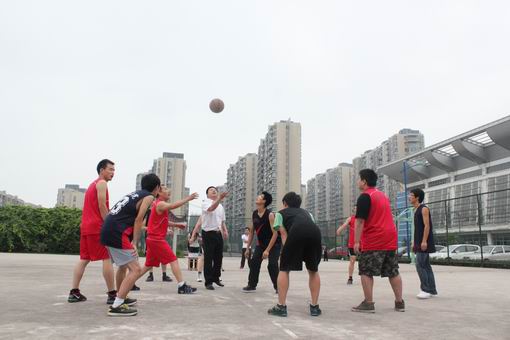哨声一响,伴随着裁判手中点球的抛起,比赛正式开始,双方队员积极拼抢,迅速进入状态。老师们没有了平时工作时的严肃,激情四溢地展开了一轮轮的进攻、防守,动作帅气利落。同学们也毫不示弱的奋力拼搏,将热情和球技展现的淋漓尽致。随着比赛的进行,现场气氛变得愈加热烈而又紧张。教职工队的老师们传球潇洒,转身跳投,动作灵敏,引发阵阵掌声;而另一队的同学们跨步迅速,巧妙地躲开重重防守,展露锋芒。他们出色的表现使现场拉拉队的加油声此起彼伏、不绝于耳,比赛也随即进入白热化阶段。每次比分的拉开都是一个高潮的开始,每次比分的追进都是一个悬念的升腾。比赛临近终场时,教职工队的老师在最后一秒凭借一个两分球的绝杀将僵持了很久的平分拉开,赢得了本次比赛。