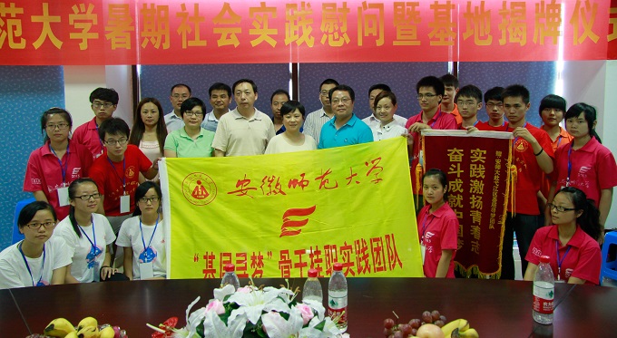 7月13日,安徽师范大学副校长李琳琦在学校有关部门和国旅学院负责同志的陪同下,来到芜湖市弋江区柏庄社区居委会,亲切慰问了国旅学院赴弋江区“基层寻梦”队骨干挂职实践团队、赴郯庐地区巢湖段“防震减灾”知识宣教及专业调研团队、赴芜湖市“雷锋导游”志愿服务团队、赴宏村“寻找安徽最美古建筑”专业写生及调研团队的队员代表。弋江区民政局、文明办,柏庄社区居委会及芜湖市志华爱心团队主要负责人热情接待了李琳琦一行,并于社区会议室召开了暑期社会实践慰问暨实践基地揭牌仪式。
