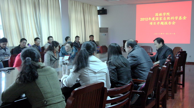 11月21日下午14:00,国旅学院第二场2012年度国家自然科学基金项目开题报告会在院三楼会议室举行,院领导、相关专业教师及研究生参加了报告会。