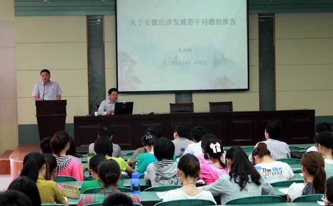 座谈会结束后,吴劲松在国旅学院实验楼101教室为国旅学院和经济管理学院200余名师生作了题为《安徽经济发展若干问题研究》的学术报告。报告中吴劲松就我省经济发展历程、十一五发展成就、未来发展趋势以及区域发展等方面对安徽省经济进行了全景式解析,数据详实,内容丰富。报告会后,吴松劲还耐心地解答了师生们提出的问题,现场气氛生动活泼。