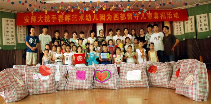 必赢2011年“永远跟党走,青春献祖国”大学生暑期社会实践活动的号角已经吹响,国旅学子携手芜湖市春晖艺术幼儿园,为即将奔赴“四川、贵州、云南”三支援建支教团队开展“安师大携手春晖艺术幼儿园为西部留守儿童募捐”活动,为援建支教团队筹得丰厚物资,成果斐然。