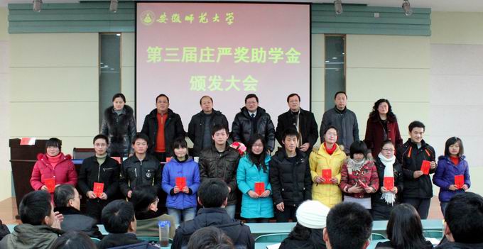 据悉,安徽师范大学庄严奖助学金自2008年起由安徽芜湖庄严基金会捐资设立,旨在通过奖励和资助的方式,帮助贫困大学生解决学习、生活上的困难,使他们能够励志成才,顺利完成学业。基金会首先在国土资源与旅游学院设立庄严奖助学金,每年捐资10万元用以资助90名国旅学院贫困大学生,目前已连续资助三届经济困难学生,受助面达270人,受助金额30万元。(国旅学院)