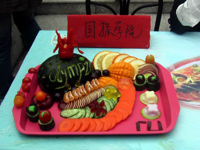 喜迎学校八十华诞,同为奥运奉献激情。2008年4月13日上午,由国旅学院学生会、经济管理学院学生会主办的“缤纷水果,五彩奥运”水果拼盘比赛在大学生活动中心门前隆重举办。