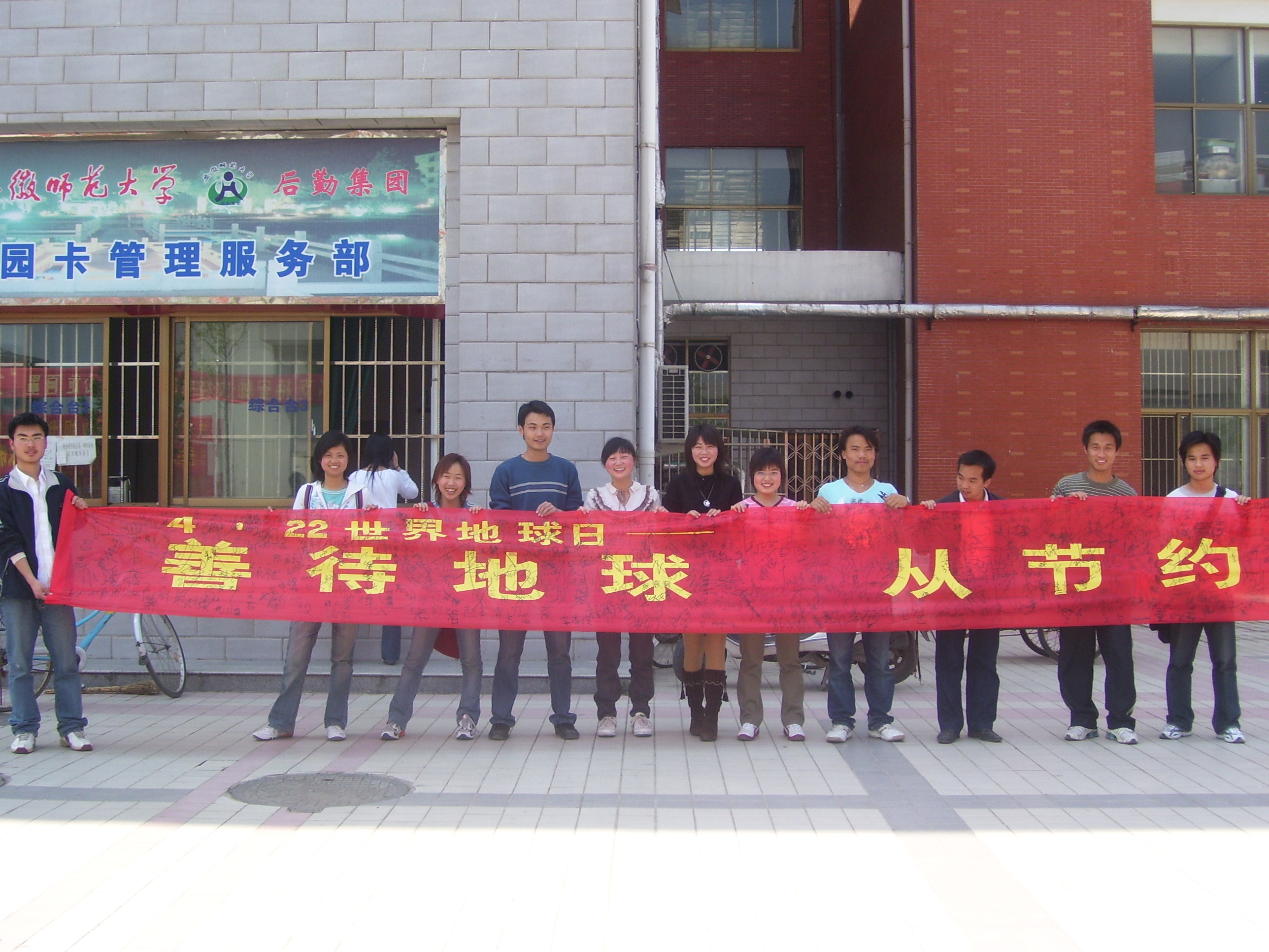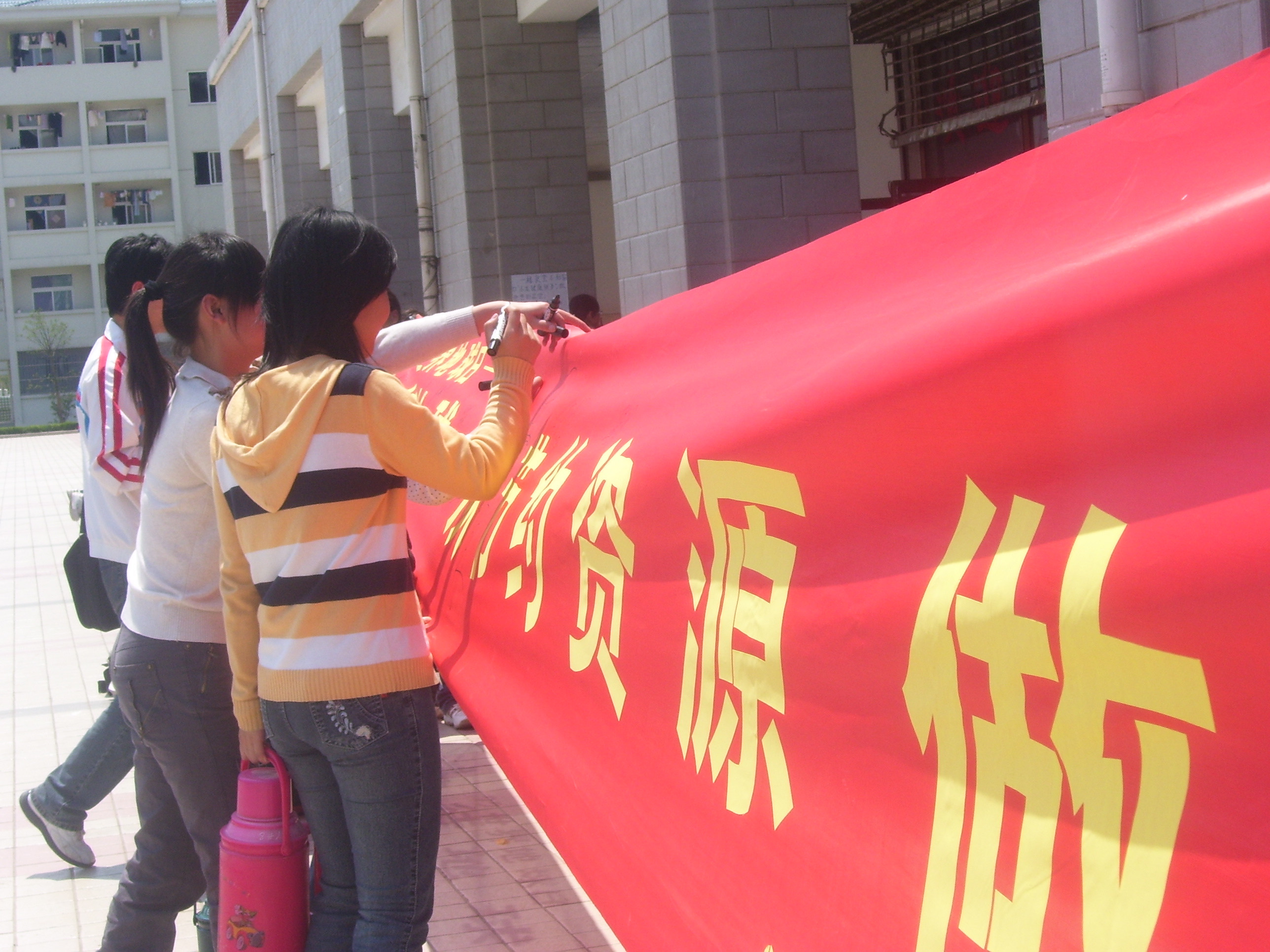 420中午1200,以“善待地球——从节约资源做起”为主题的大型签名活动在一食堂门前拉开帷幕。在十米长的横幅上,几百名莘莘学子签名纪念。