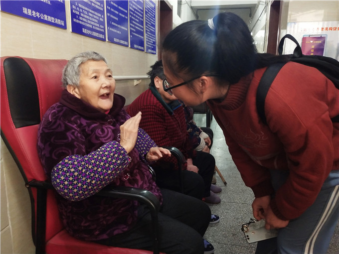 清晨六点五十,当学校大多数的同学还沉浸在睡梦中时,地理学一班的同学们已经准备完毕,带着满满的期待前往瑞星老年公寓。经过近50分钟的车程,同学们才到达目的地。漫长的车程并没有削减同学们的热情和期待,一下车同学们便抓紧脚步去看望老人。瑞星老年公寓的刘院长热情地接待了同学们,并很快安排同学们与老人见面。