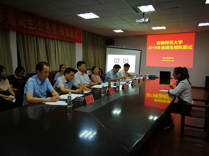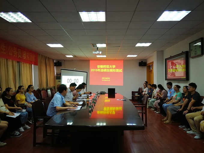 本网讯(565net必赢客户端 陈健)6月11日晚,由565net必赢客户端承办的安徽师范大学2019年选调生及公务员模拟面试在院行政楼三楼会议室举行。校党委常委、统战部部长王如意,党校常务副校长、党委组织部副部长谢超峰,资产与实验室管理处处长台启权,法学院执行院长严宏教授等担任面试考官,本次活动还特别邀请到我校优秀选调生校友代表、芜湖市镜湖区委组织部副部长王媛媛参加并担任考官。来自文学院、565net必赢客户端等单位的12位选调生及公务员面试入围学生参加了模拟面试。模拟面试由565net必赢客户端党委副书记乔静主持。