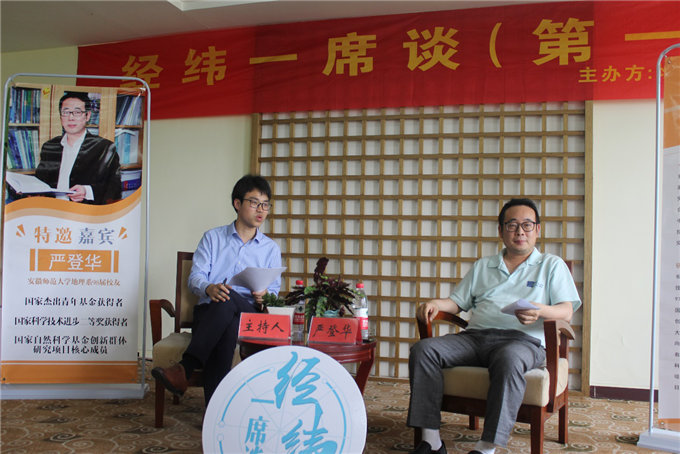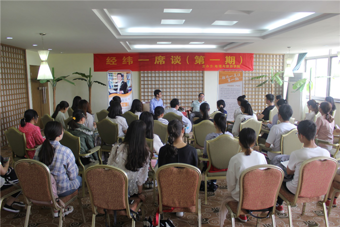 本网讯(565net必赢客户端 陈祥云、孙常慧)5月19号下午两点,565net必赢客户端经纬一席谈第一期在实验楼320正式开讲。此次特邀安徽师范大学地理系98届杰出校友、国家杰出青年基金获得者、国家科学技术进步二等奖获得者严登华教授作为第一讲嘉宾。活动由学院团委书记吴辉主持,院党委副书记乔静、副院长方凤满、院团委副书记陈祥云,以及从全院遴选的30名同学参加此次活动。