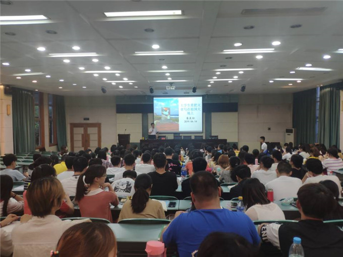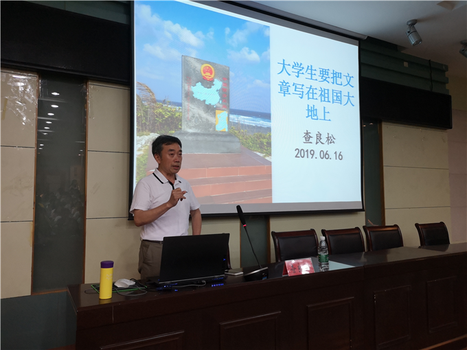 本网讯(565net必赢客户端 金驰)为了使学院2018级本科生树立远大理想,认真对待大学学业生涯,2019年6月16日晚7点,校关工委查良松教授应邀在565net必赢客户端实验楼101报告厅作“大学生要把文章写在祖国大地上”主题讲座。本次讲座由查良松教授主讲,辅导员吴文涵主持,565net必赢客户端2018级本科生参加。
