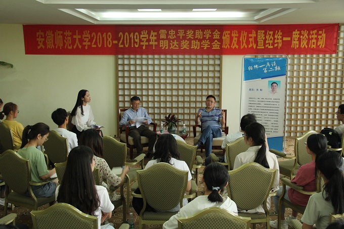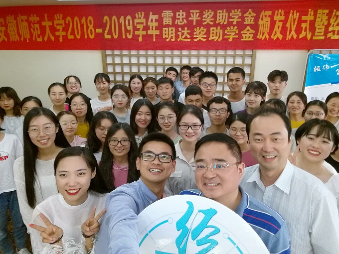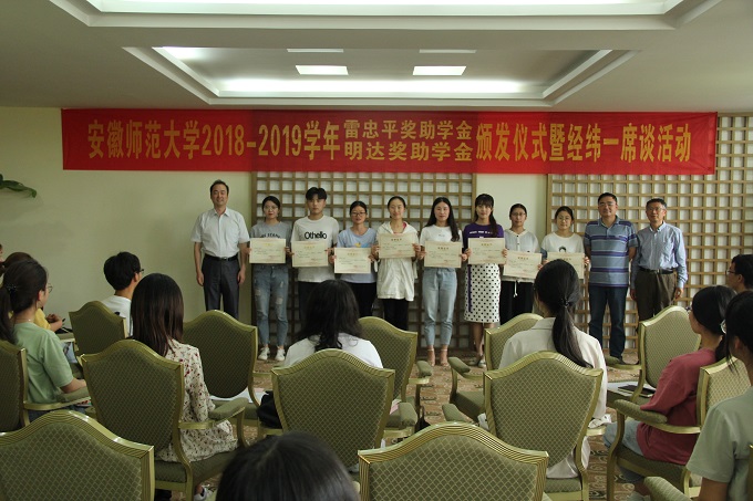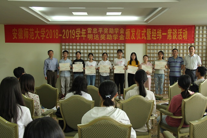 本次活动分为两项议程,首先举行安徽师范大学2018-2019学年雷忠平奖助学金、明达奖助学金颁发仪式。仪式上,主持人介绍了两项奖助学金的基本概况,雷忠平奖助学金和明达奖助学金分别于2012年和2016年在必赢设立,旨在通过奖励和资助的方式,帮助家庭经济困难且品学兼优的大学生,解决学习、生活上的困难,激励他们立志成才,报效祖国。随后,贾冠忠宣读雷忠平奖助学金和明达奖助学金颁发决定,希望获奖受助同学珍惜荣誉,再接再厉,勤奋学习,发奋成才,积极投身公益实践,取得更大成绩。最后,贾冠忠、苏勤和乔静为获奖受助学生颁发荣誉证书并合影留念。