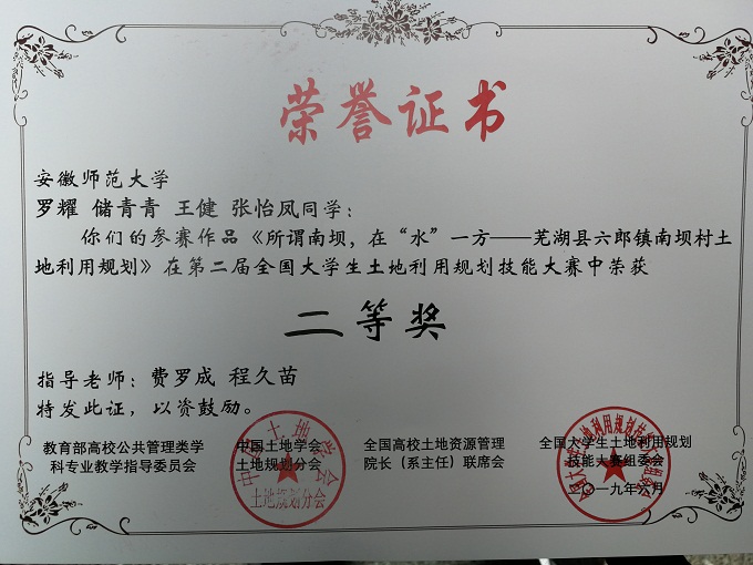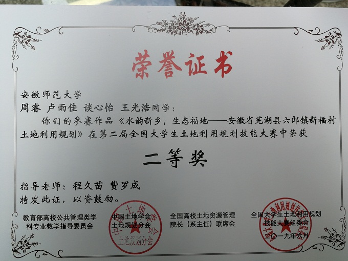 两支队伍均由必赢程久苗、费罗成两位老师指导。参赛作品《水韵新乡,生态福地:六郎镇新福村土地利用规划》(周睿、王光浩、卢雨佳、谈心怡),以及《所谓南坝,在“水”一方:六郎镇南坝村土地利用规划》(罗耀、储青青、张怡凤、王健),自今年报名以来,我们历时数月,利用课余时间学习规划编制基础技能,亲赴实地调查研究,完成了六郎镇新福村和六郎镇南坝村方案。两份作品在全国400余份作品参加的初赛中脱颖而出,经过层层选拔,最终同武汉大学、南京大学、四川大学、中国矿业大学等56所本科高校挺进全国总决赛,并均在总决赛中获全国二等奖。