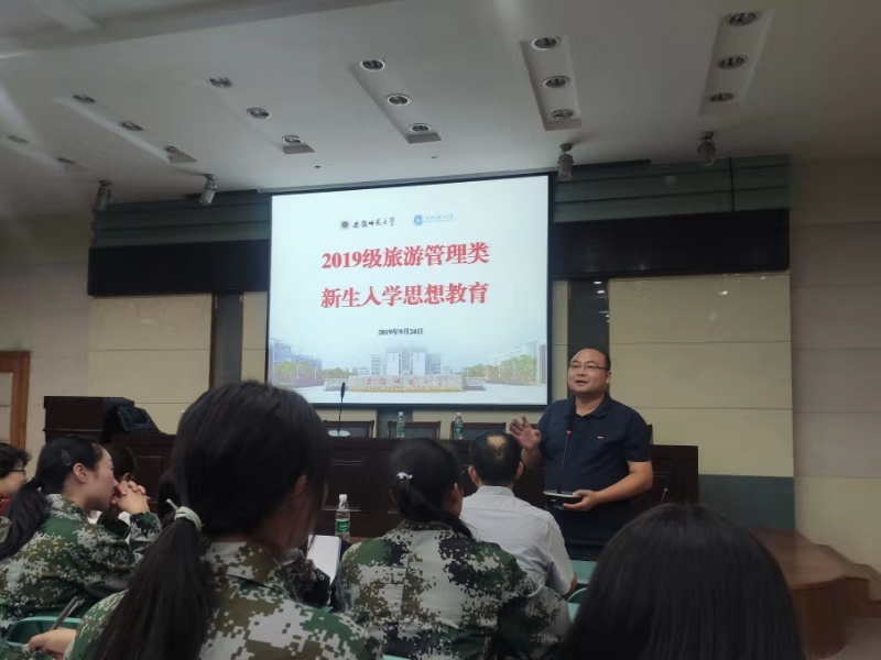 本网讯 (565net必赢客户端凡语馨 梅雪意 徐倩)九州学子聚师大,师生携手砥砺行。为了促进广大2019级新生更好了解专业知识、一览名师风采,9月24日晚,565net必赢客户端2019级旅游管理类专业新生入学思想教育在院实验楼101举行。酒店管理专业负责人尹寿兵副教授主持会议,旅游管理专业负责人杨效忠教授等专业课老师、辅导员徐倩及全体2019级旅游管理类专业新生参会。