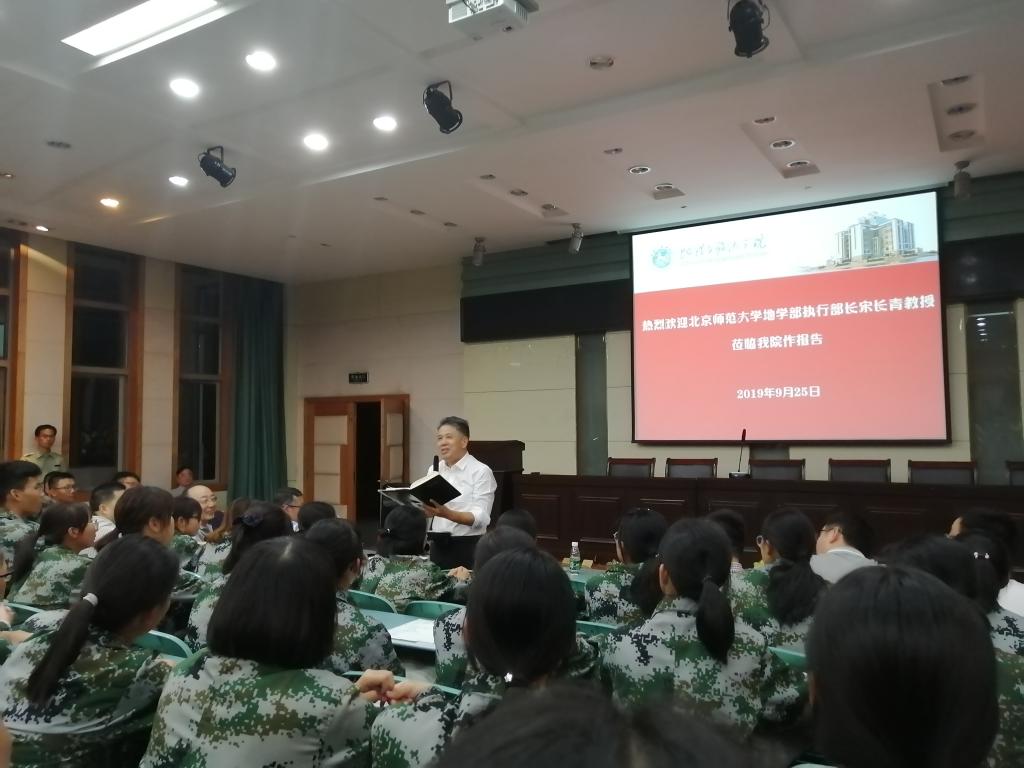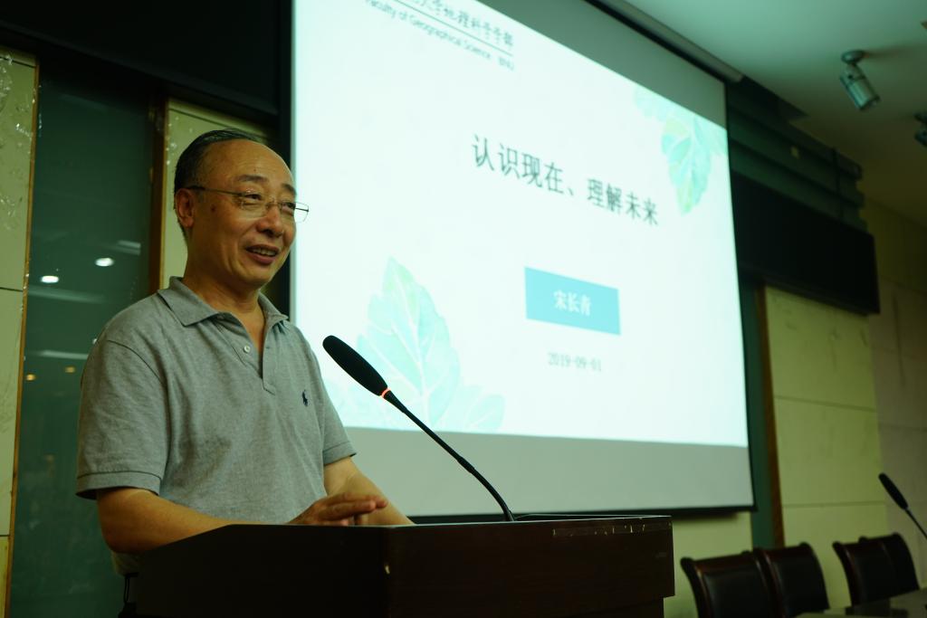面对2019级地理学新生,他向同学们提出四点把握:把握你的选择、把握你的运气、把握你的机会、把握你的时光。珍惜时光、努力学习,成为更好的自己。并指出地理学在指导人生中的作用。在把握时代部分,他谈到,地理学子要了解小世界,理解大时代,认识新机遇、创造真未来。现在是智能时代、移动时代,地理学要紧扣时代脉搏,不断进步发展。