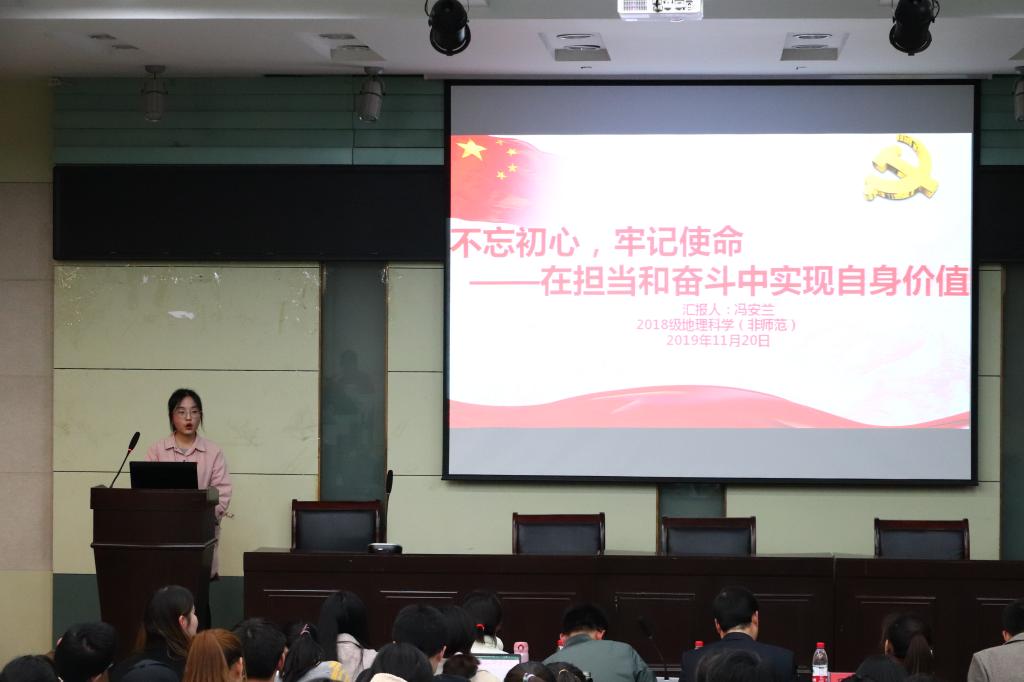 决赛环节,各位选手紧紧围绕主题教育的总目标和具体要求,结合先进典型和身边先锋模范的事迹,结合思想实际、生活事例、社会实践,谈认识、说体会、讲感悟、话成长,阐述自己对“不忘初心、牢记使命”主题教育的理解、认识和践行。其中,2018级地理科学(非师范)专业的孙浩畅同学以“教师援疆计划”为切入点,讲述了在自己最重要、最需要关怀的高考期间,父亲赴新疆和田支教、为西部教育事业贡献力量的故事,在场师生都深深地被她的父亲所感动。整场比赛主题突出、内容鲜活、形式生动,同时以小见大、寓理于情,精彩的微党课博得听众的阵阵掌声。
